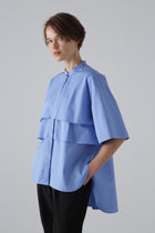 裾部分に向かって重なった切りかえが特徴。トーマスメイソンの素材を使用したティアードブラウスです。