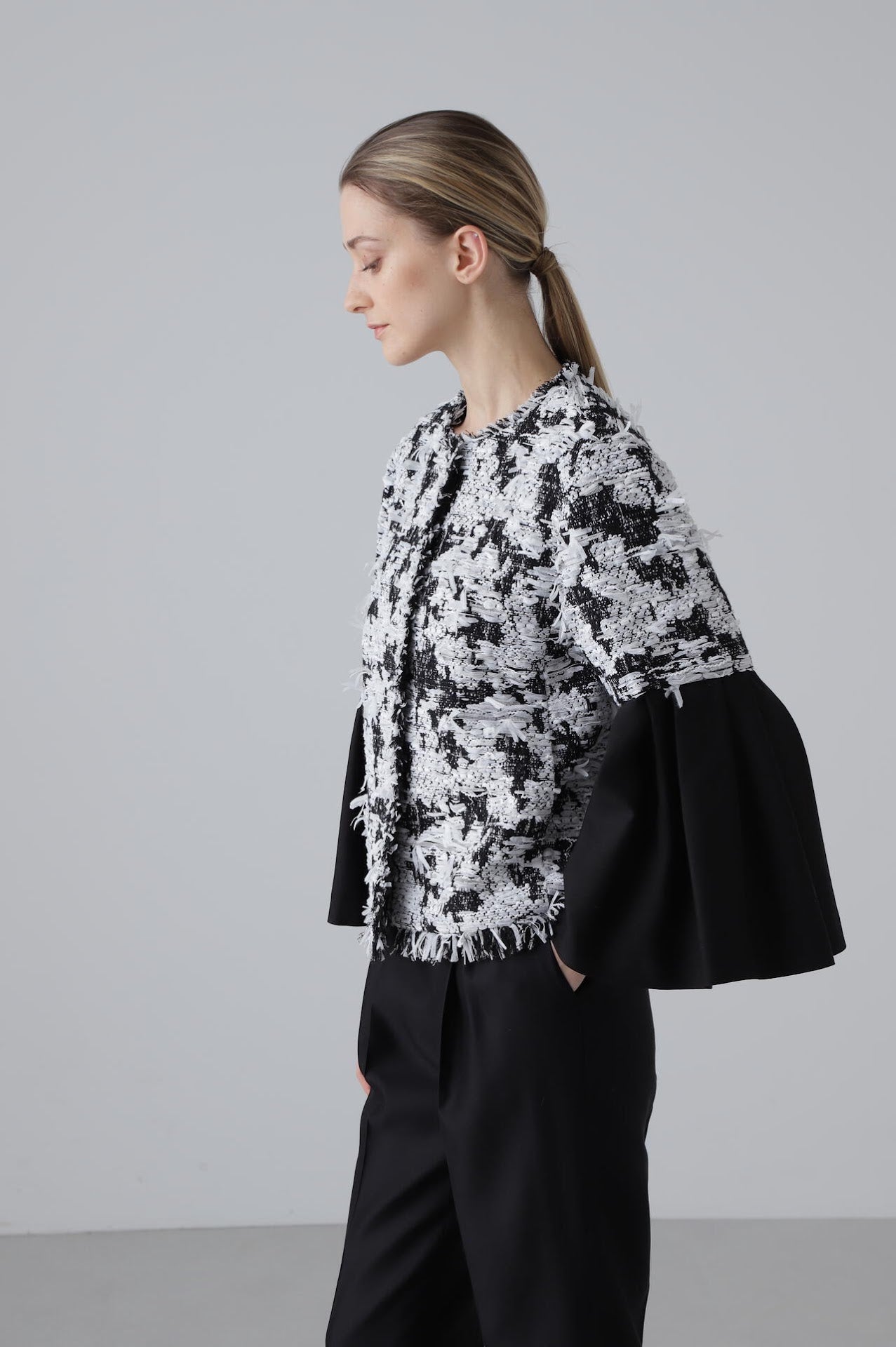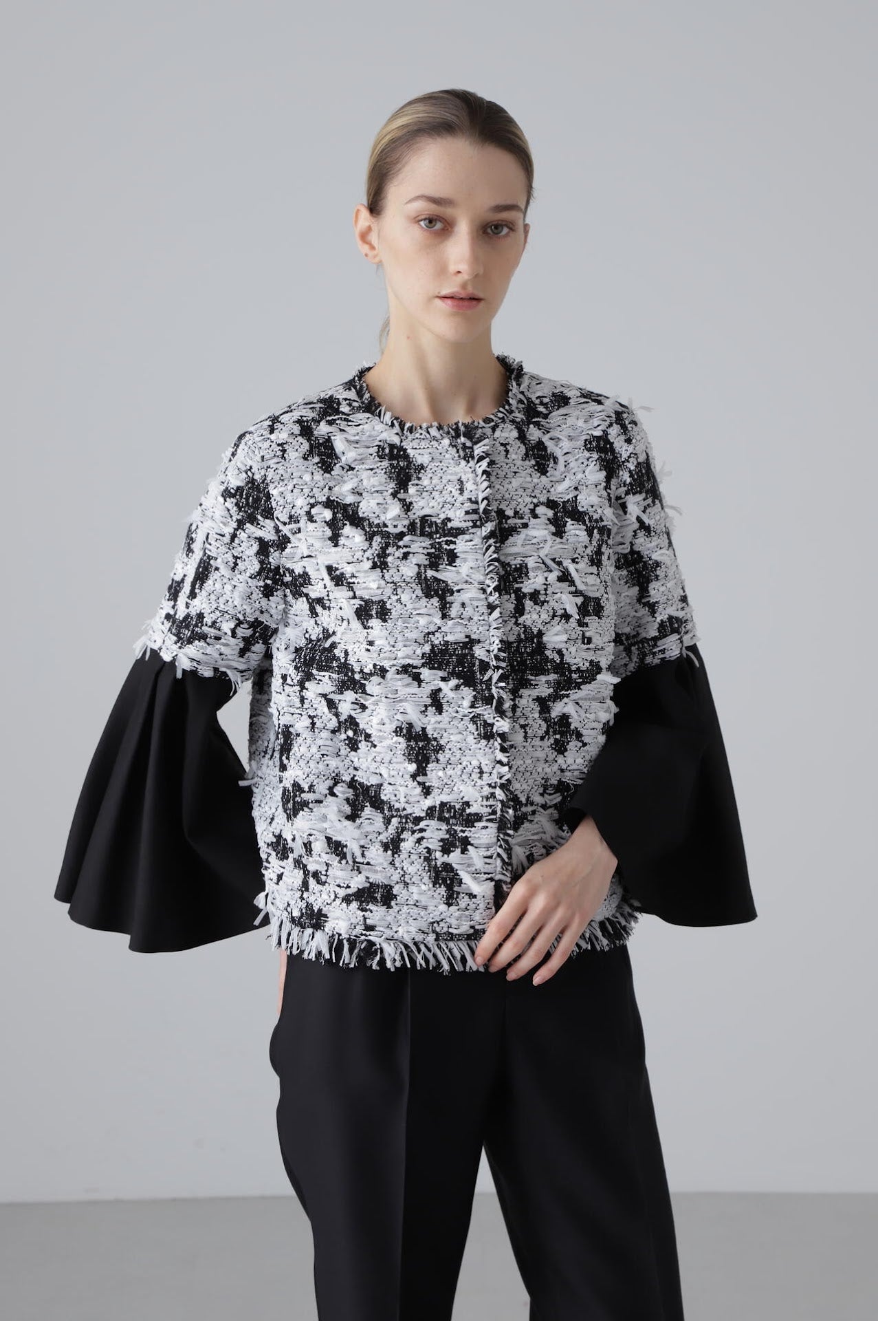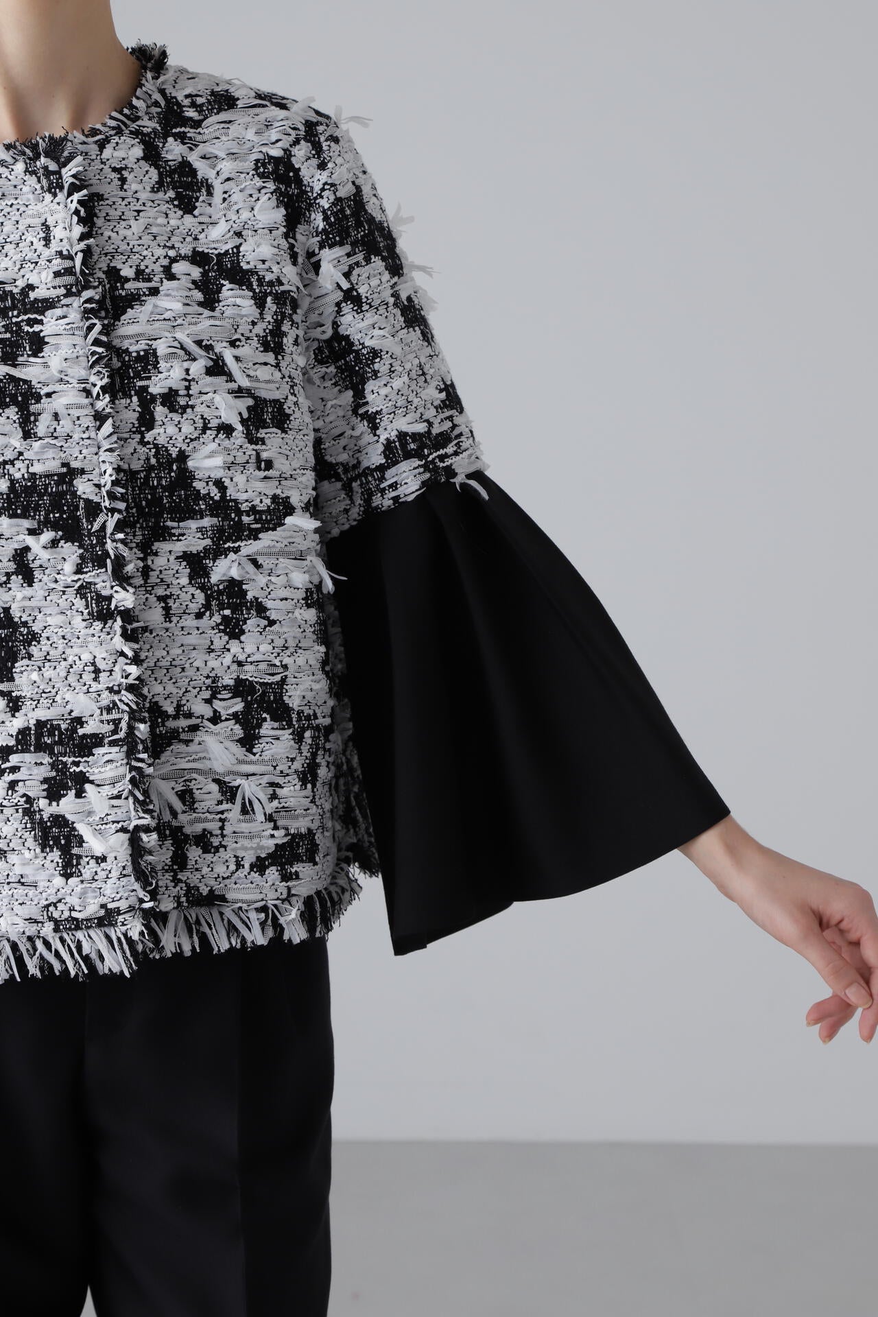 主役級の存在感のある素材で、シルエットはコンパクトなシンプルなフォルムです。袖部分に別素材のシルクウールを使用し、華やかなシーンにも最適。長年愛用いただける高級感ある一枚に仕上げました。