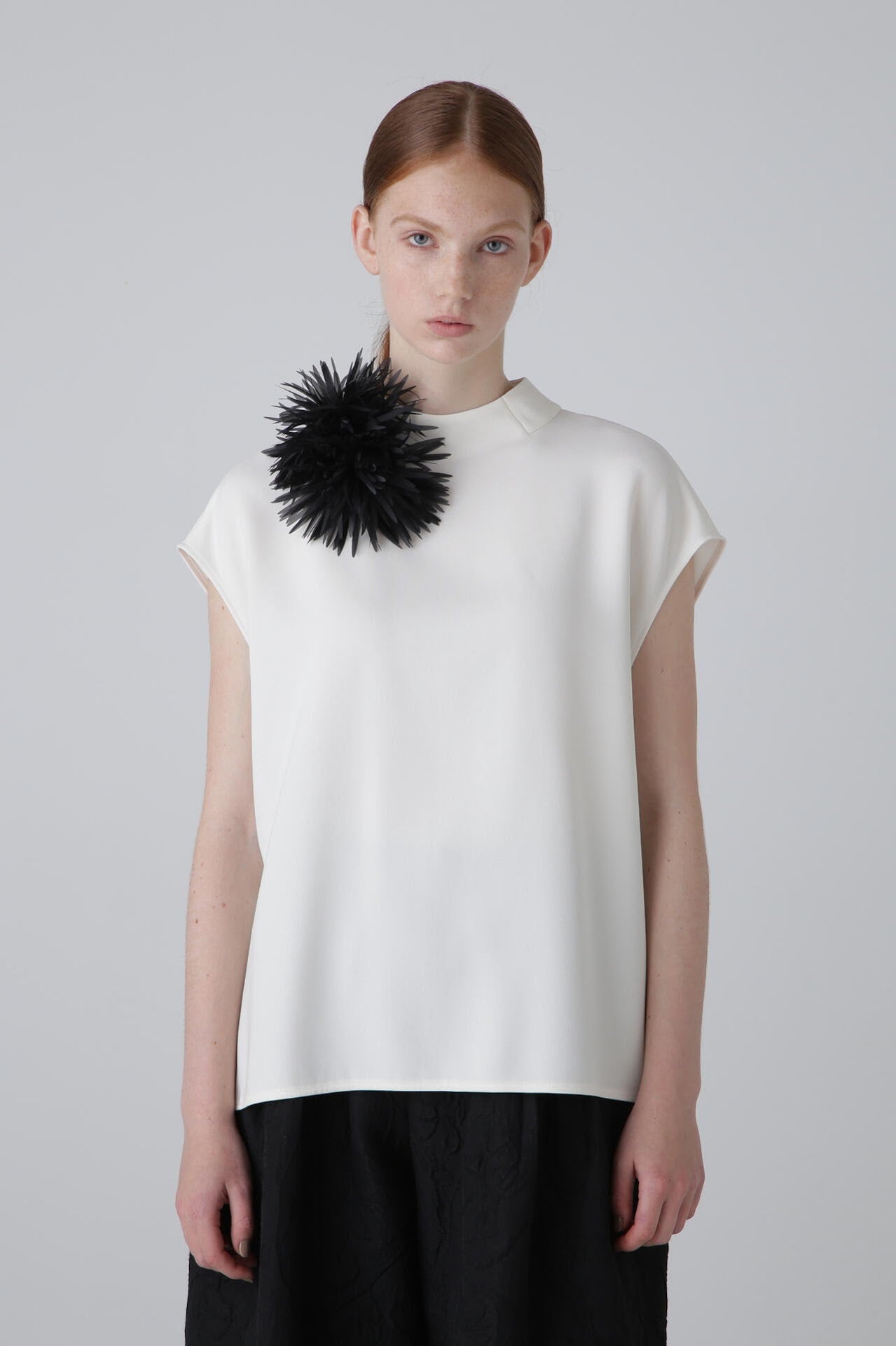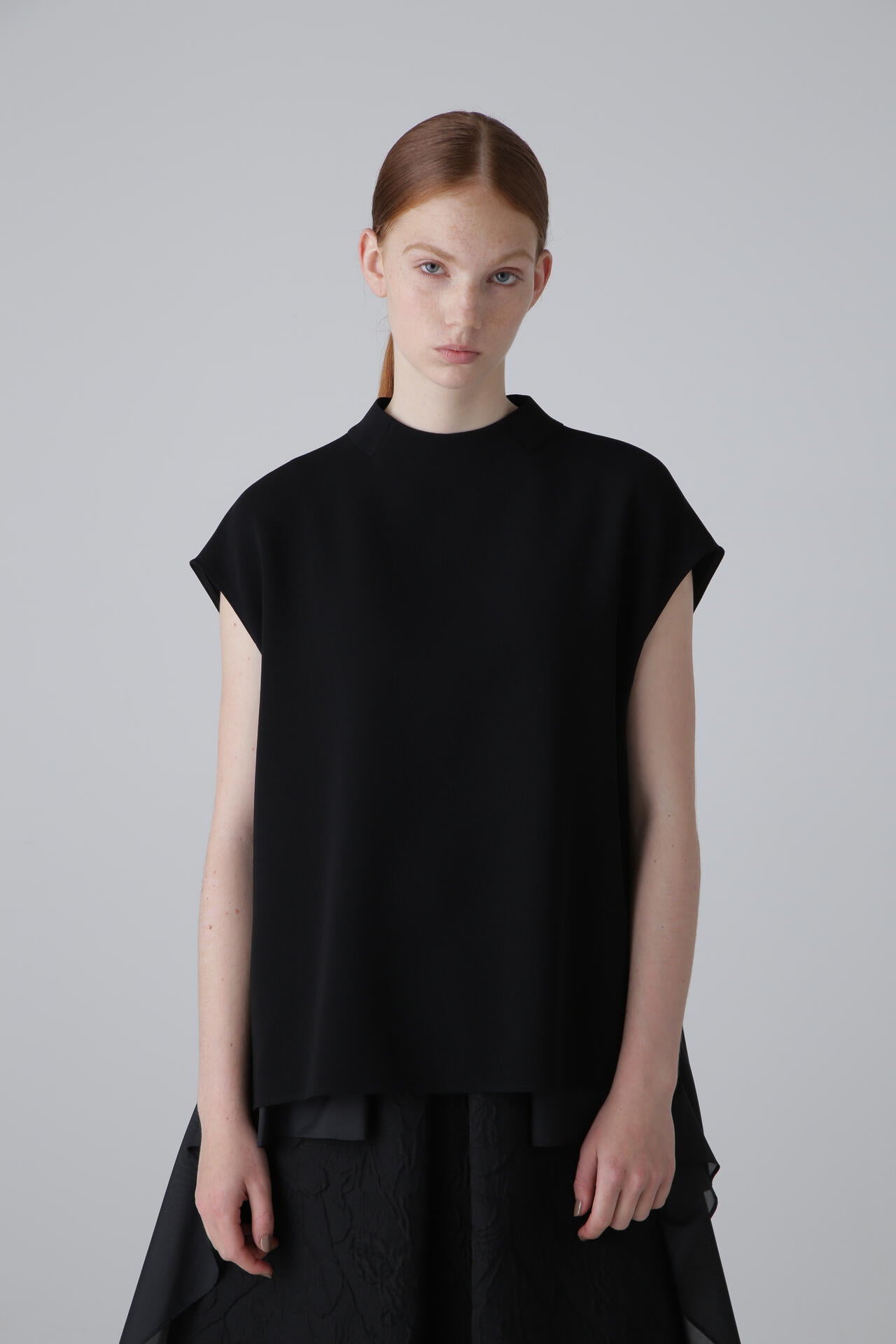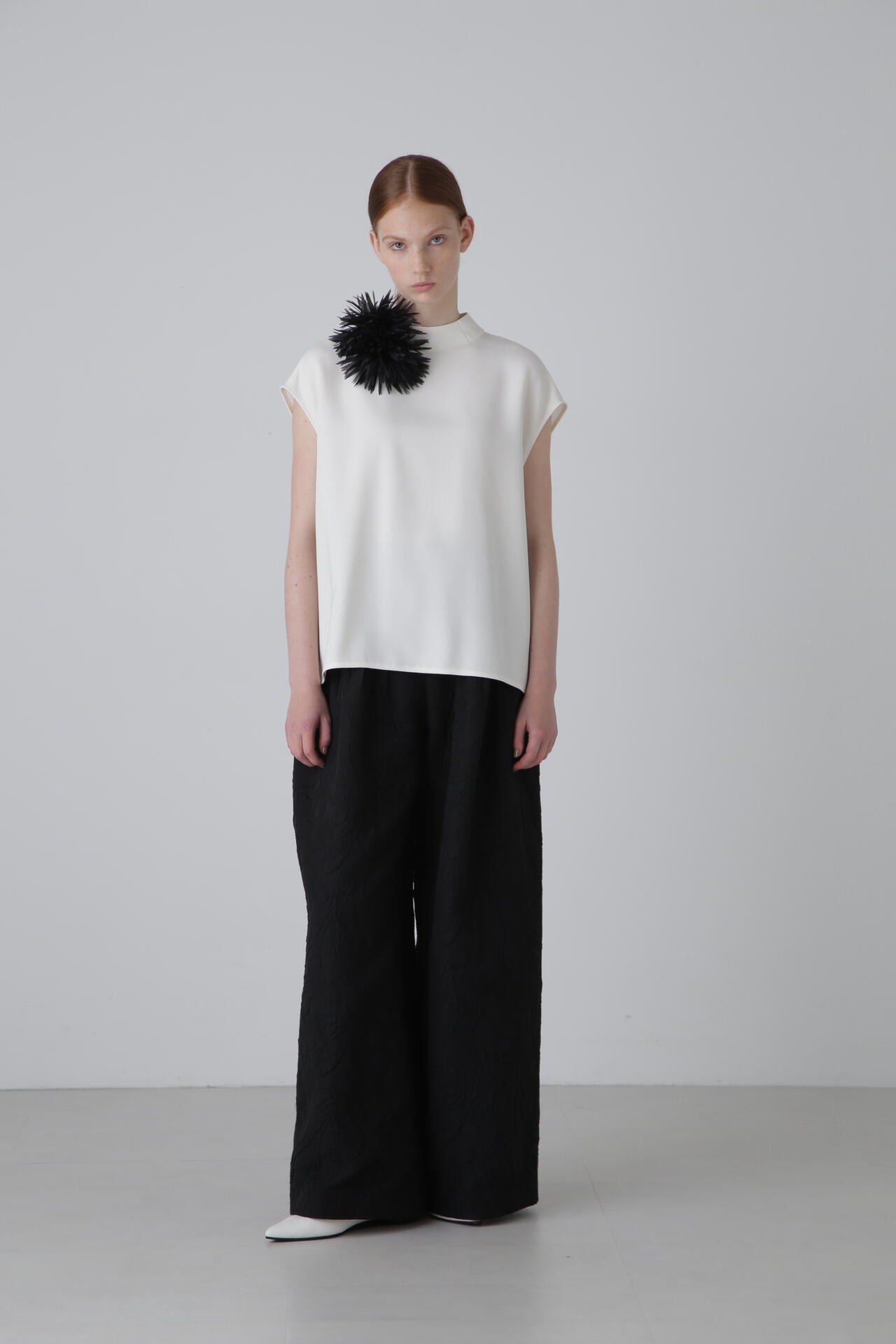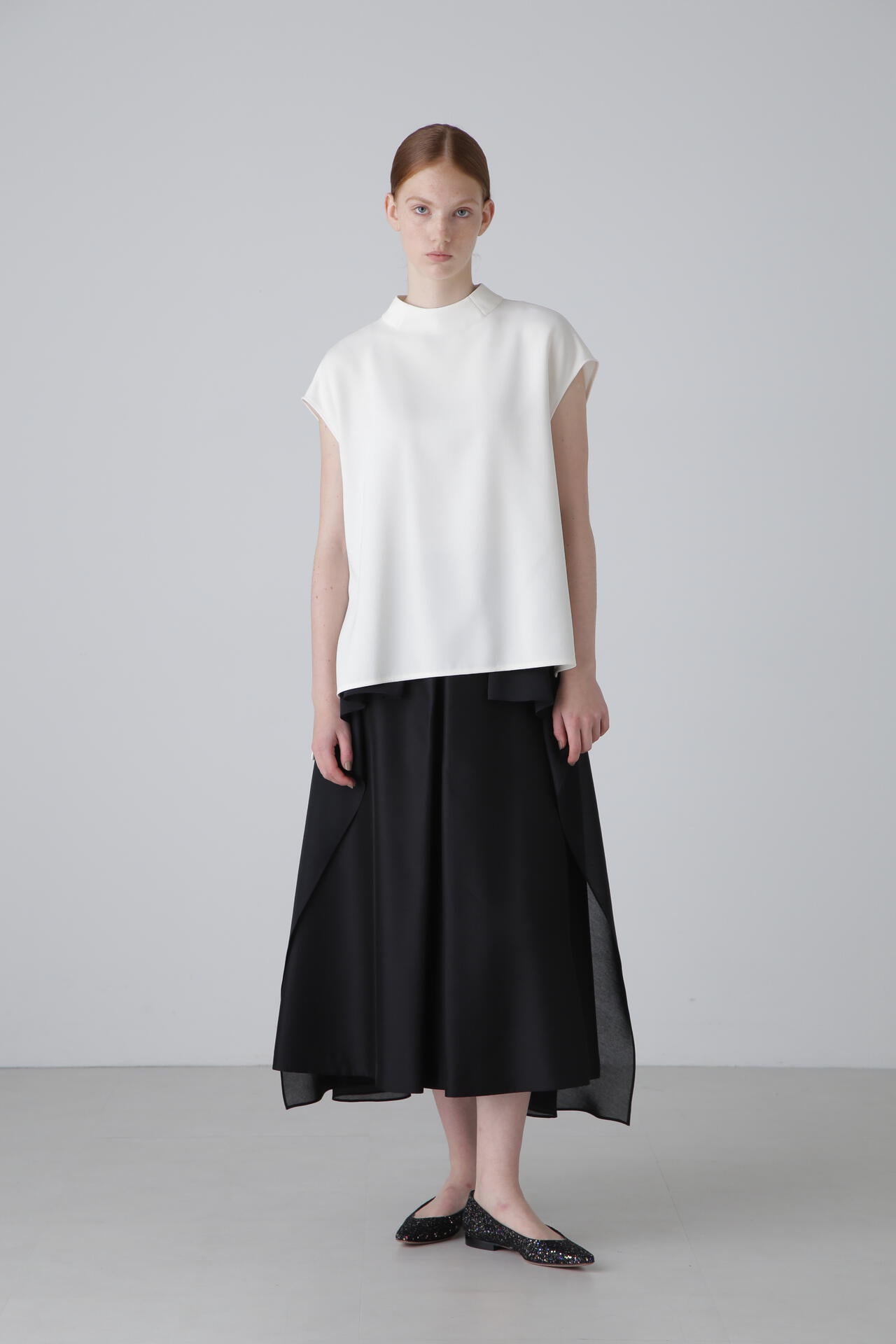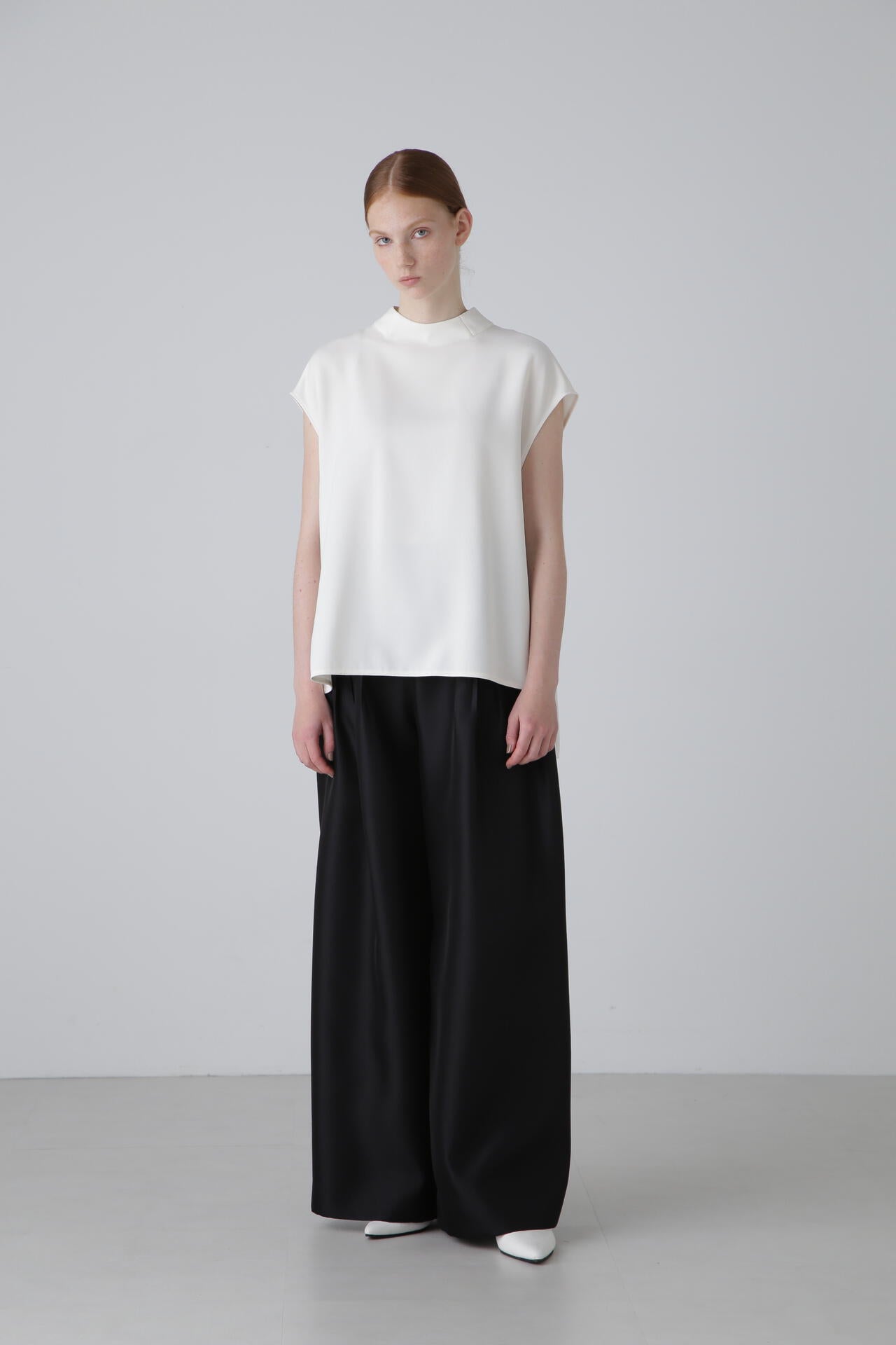 程よい高さのスタンドカラーがさりげないアクセントのフレンチスリーブブラウスです。