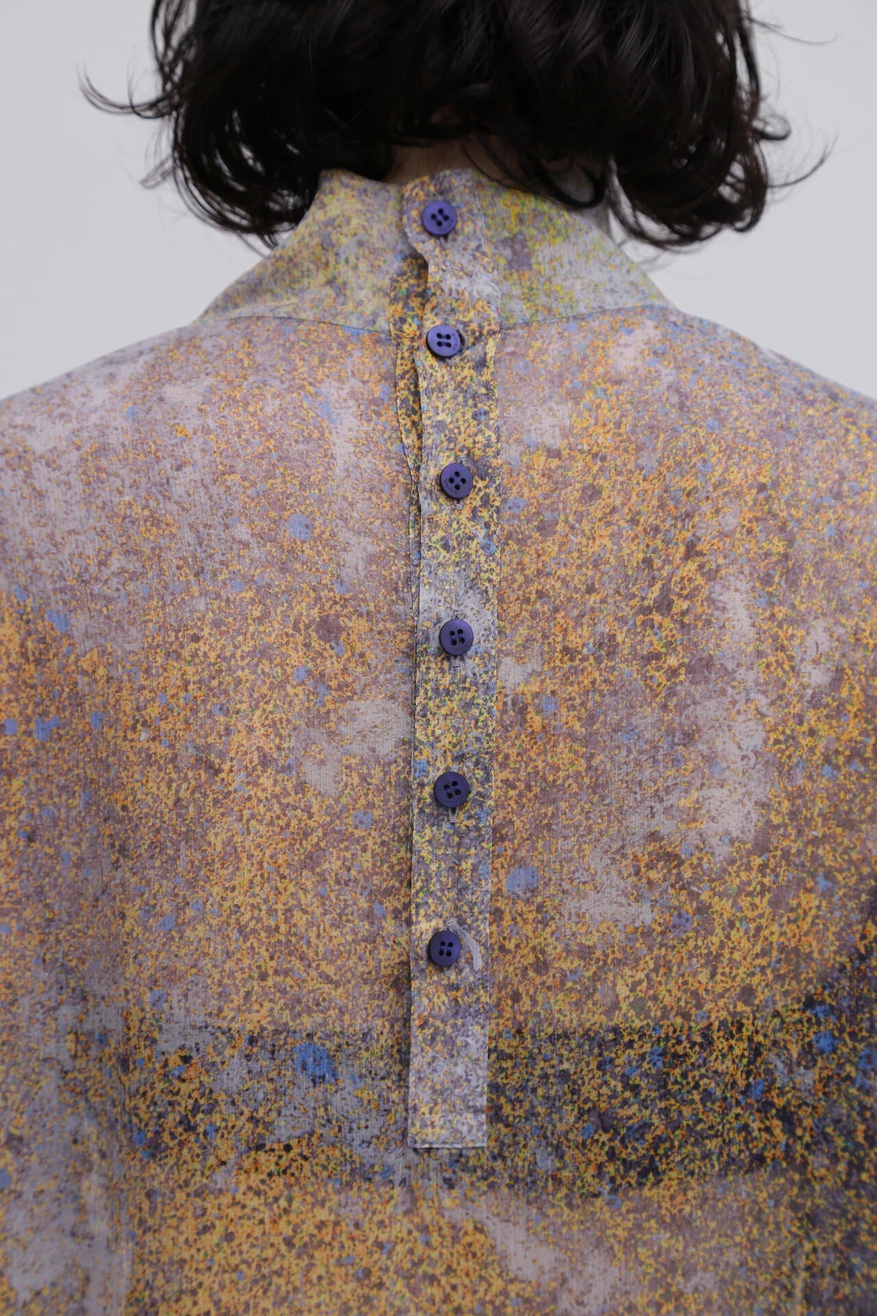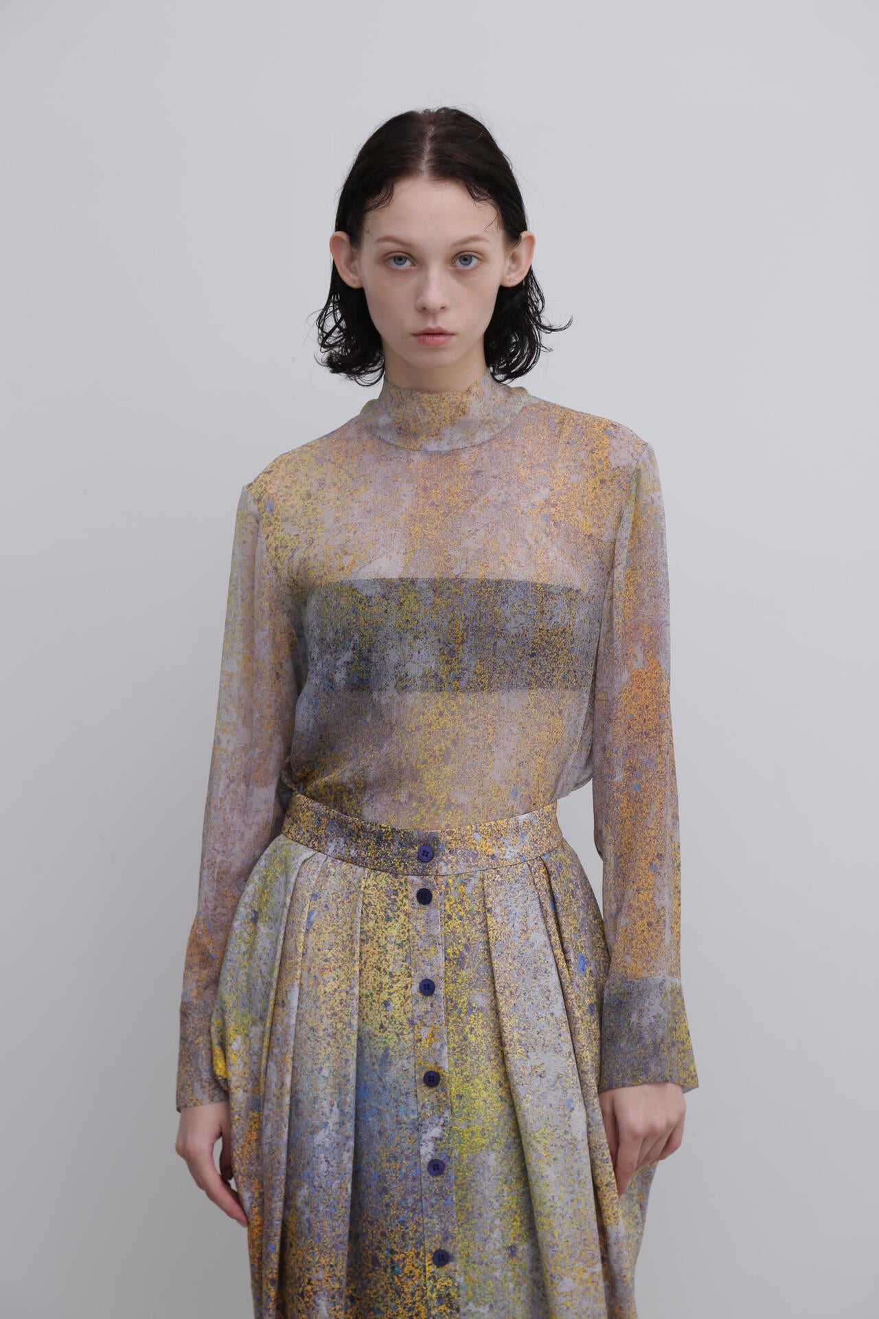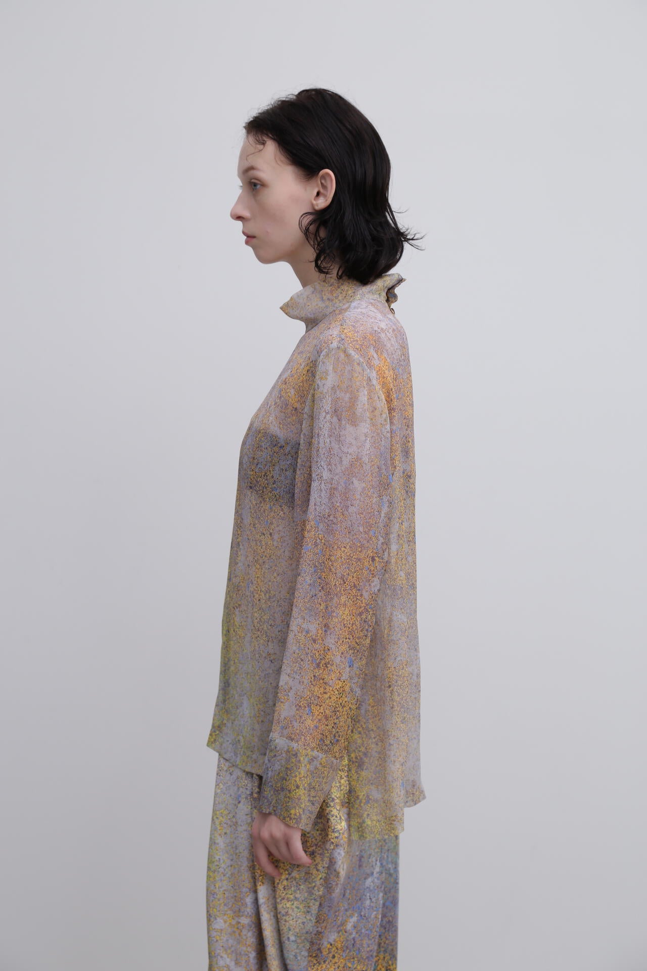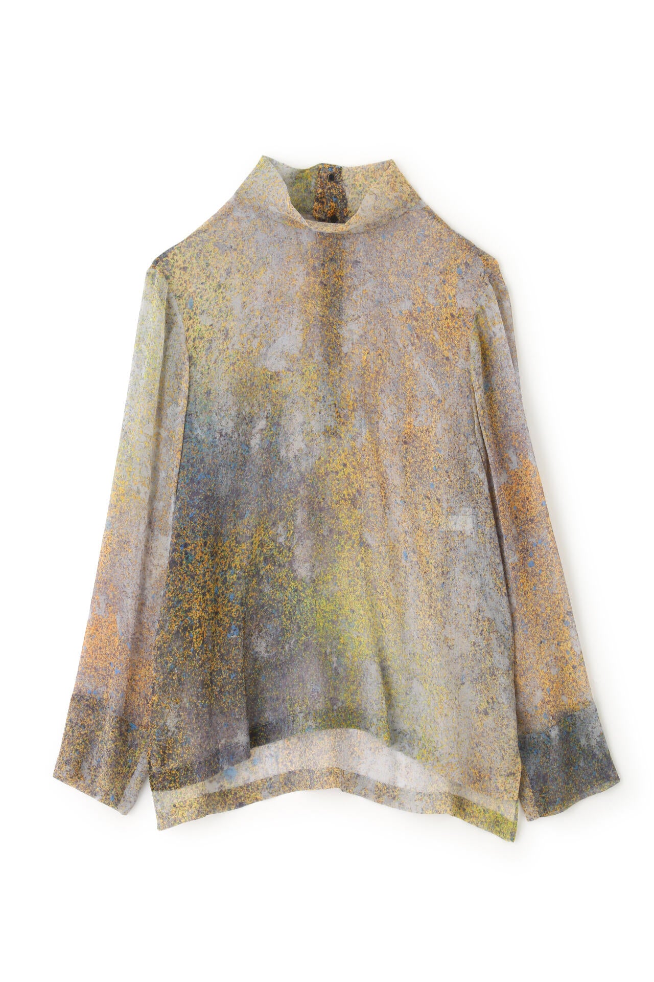 シンプルなハイネックルーズブラウスでインナーのブラウスとして万能にお使いいただけます。