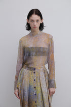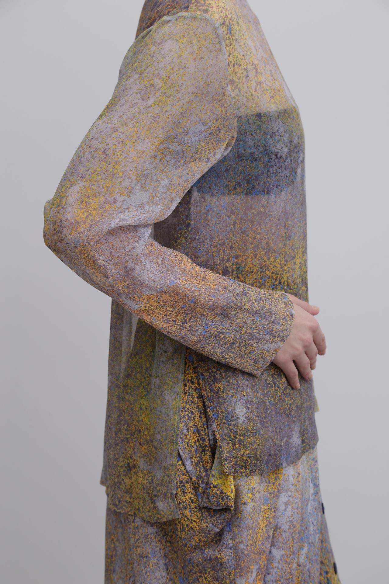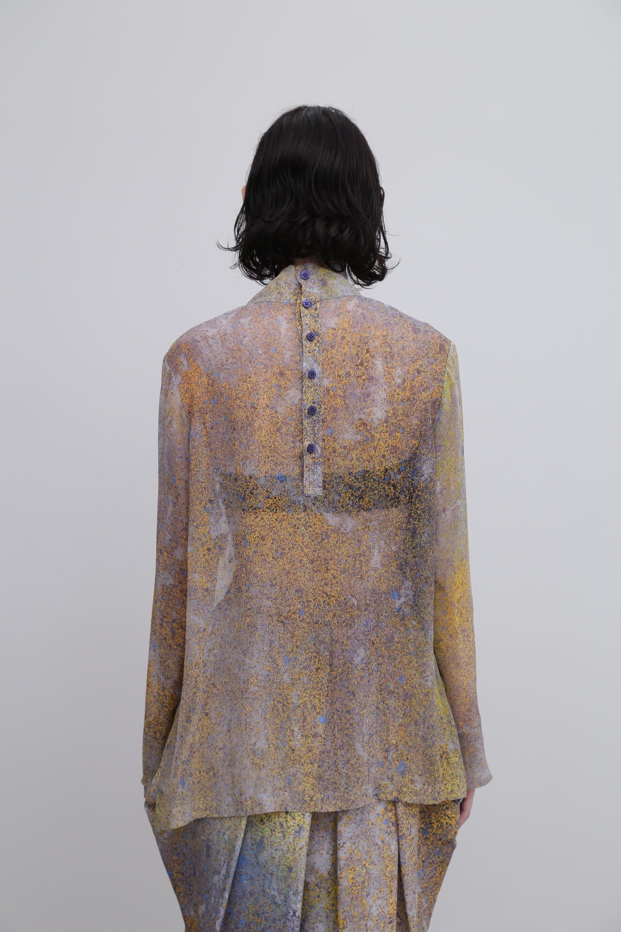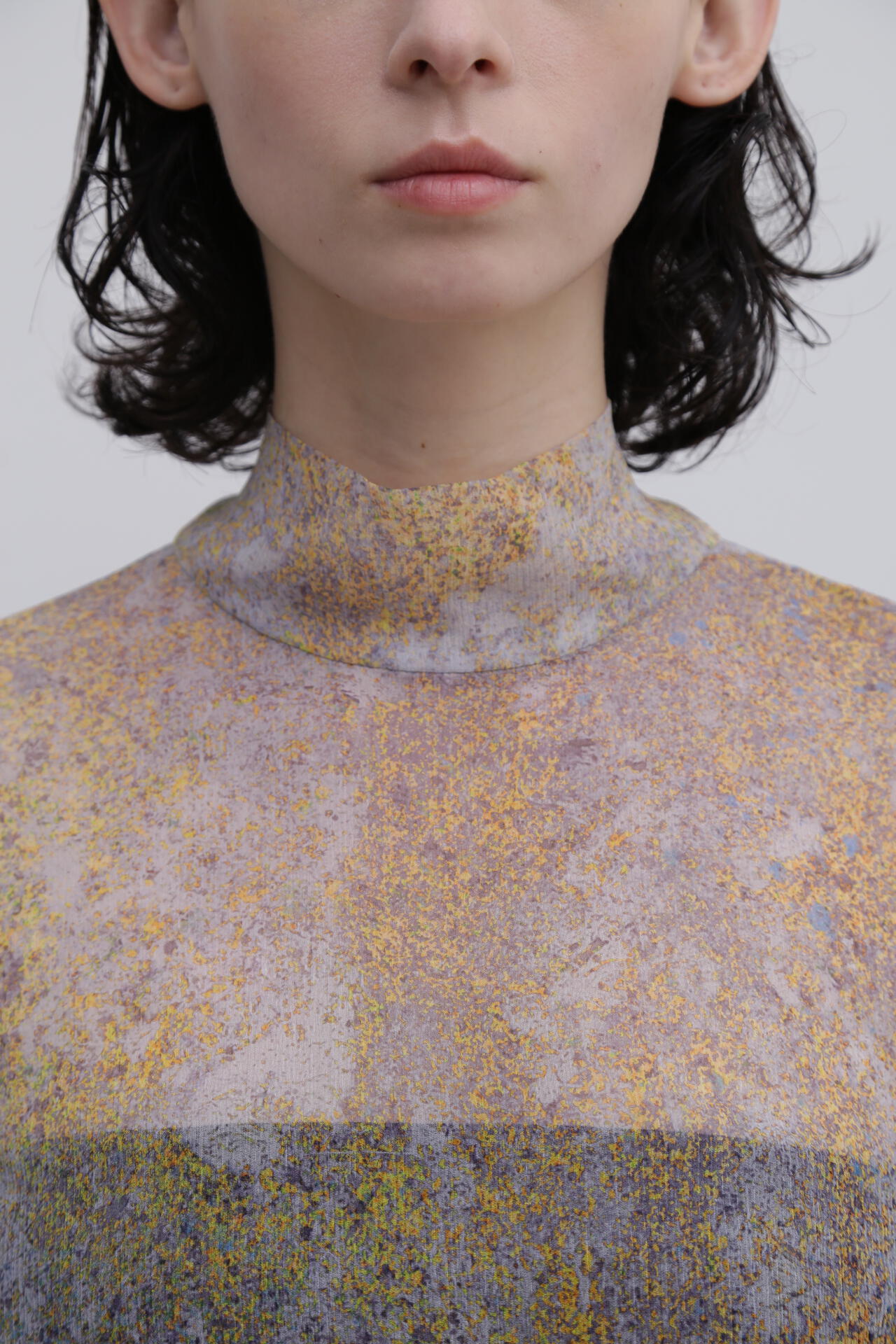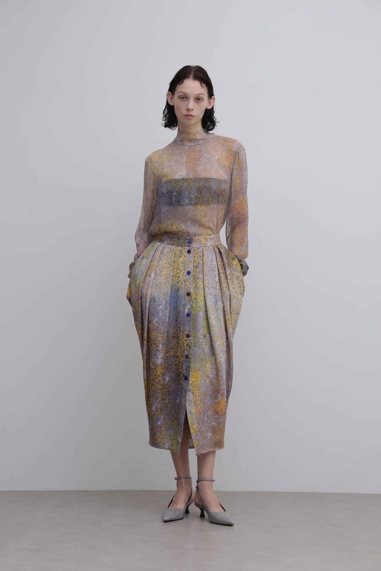 シンプルなハイネックルーズブラウスでインナーのブラウスとして万能にお使いいただけます。