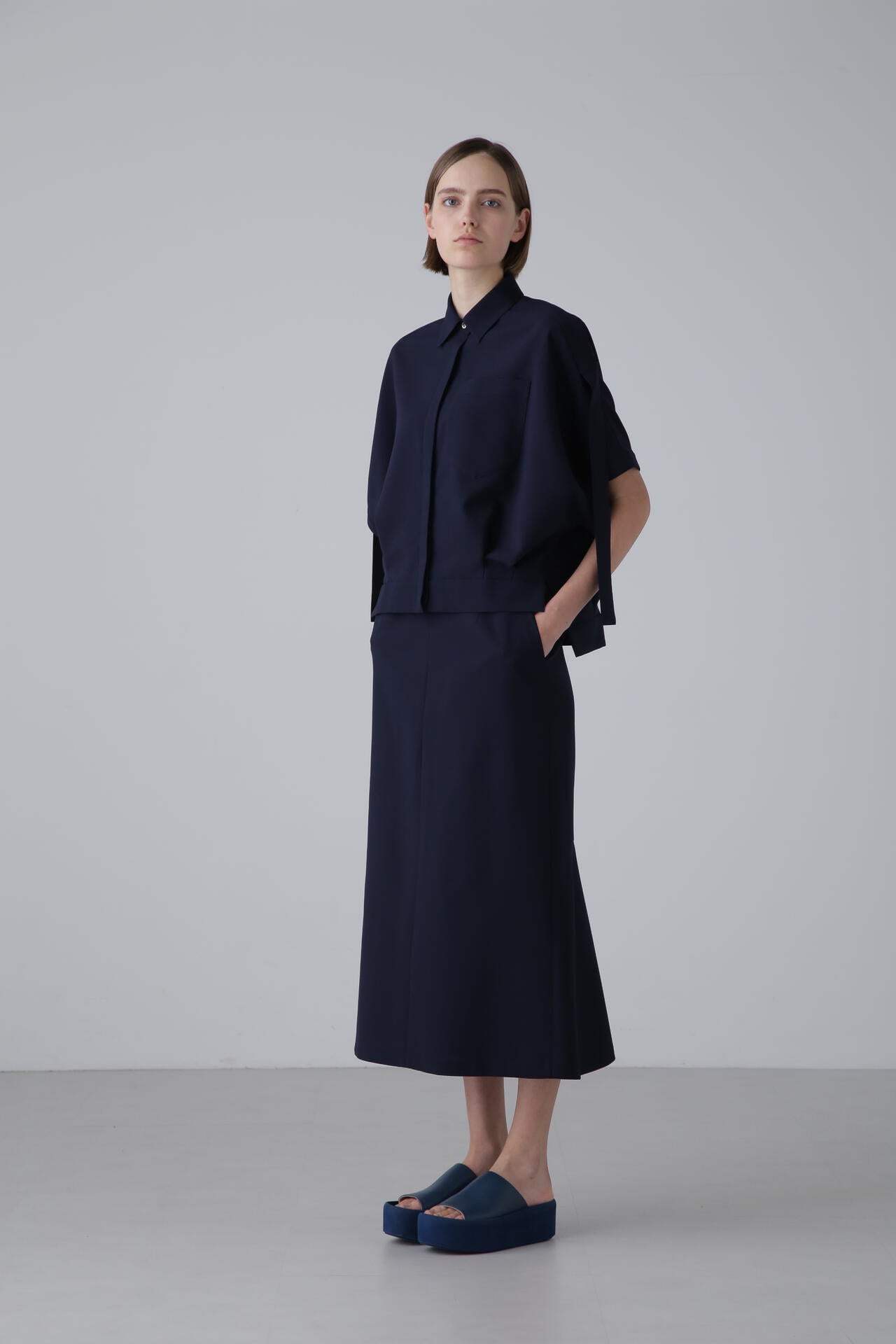 前からのデザインはミニマルにそぎ落とされたデザインで、バックの裾部分に緩やかなフレアを持たせた万能スカートになります。