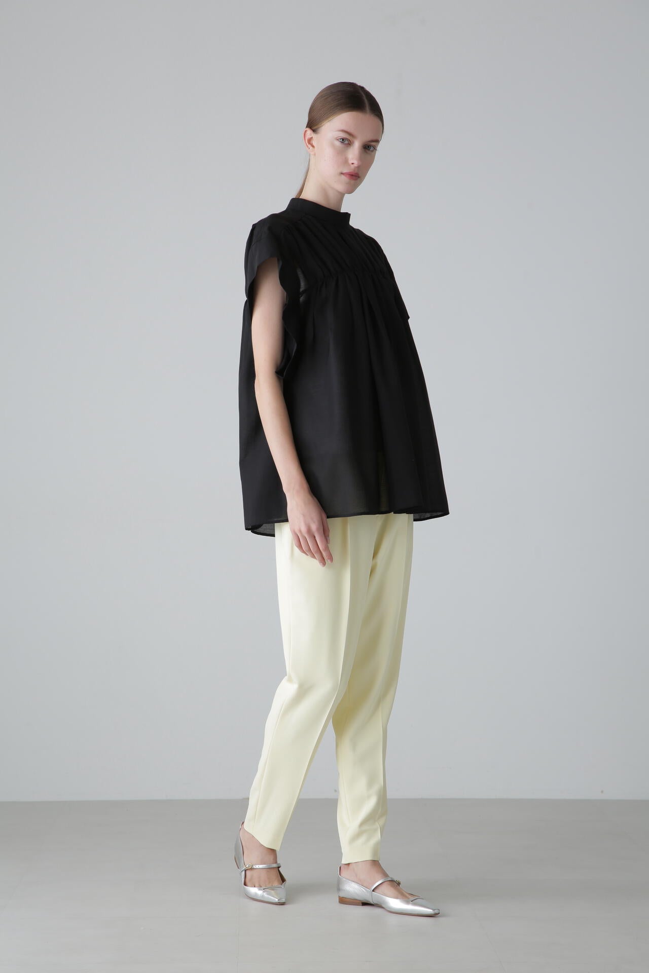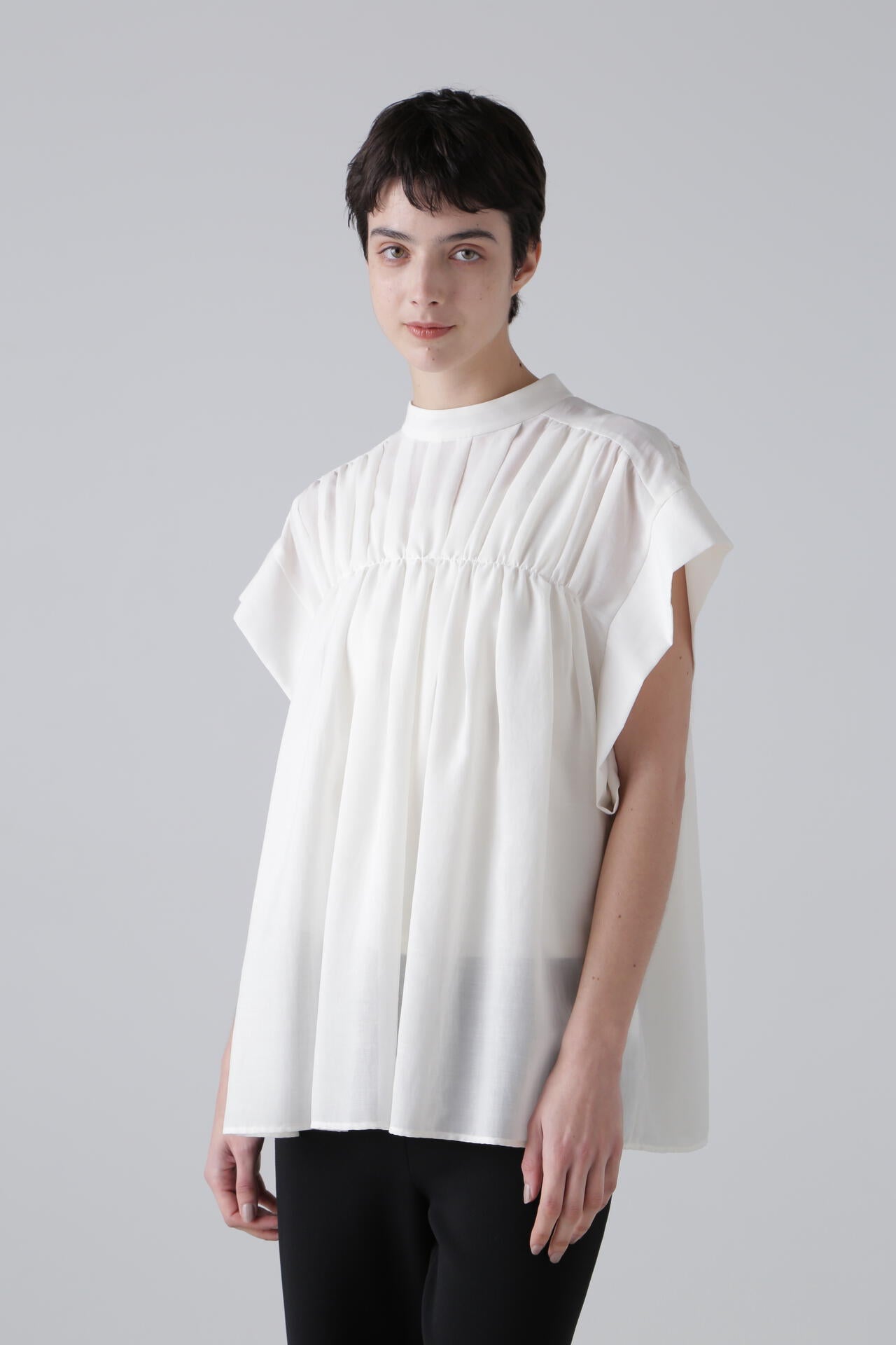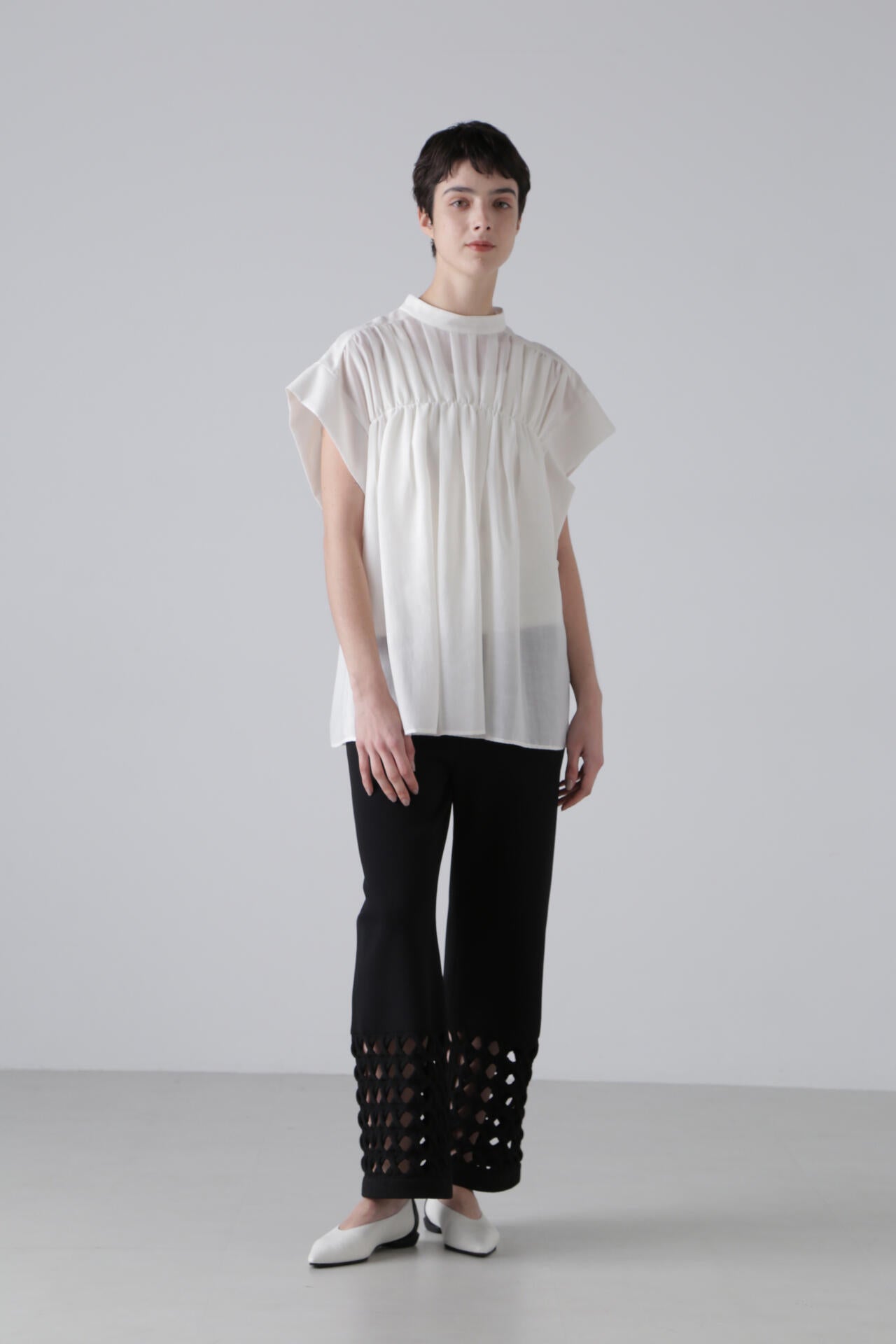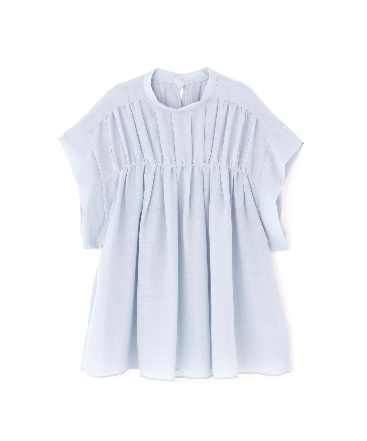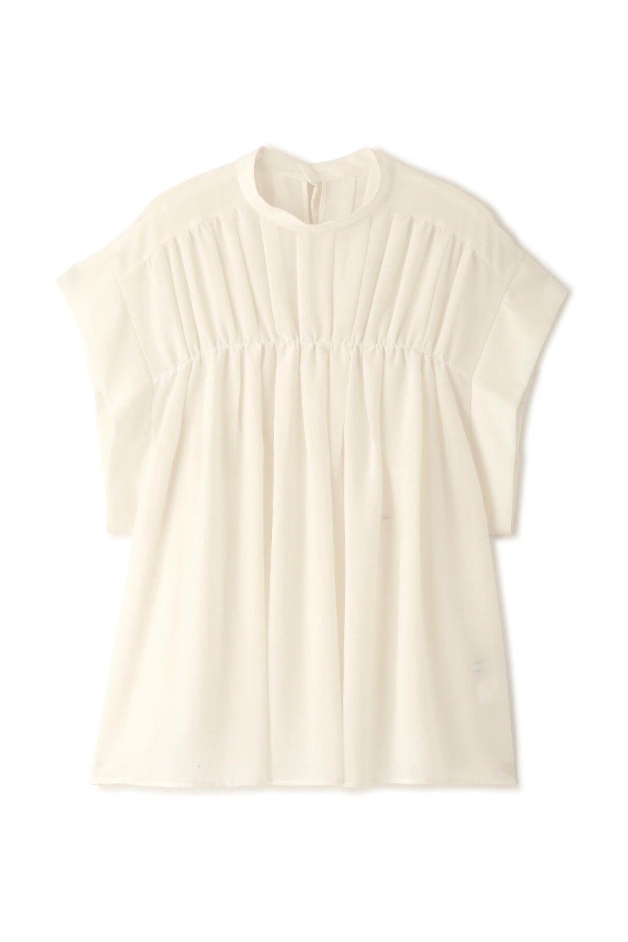 ライトで透け感のある素材に、ランダムなタックをふんだんに入れた華やかなブラウス。