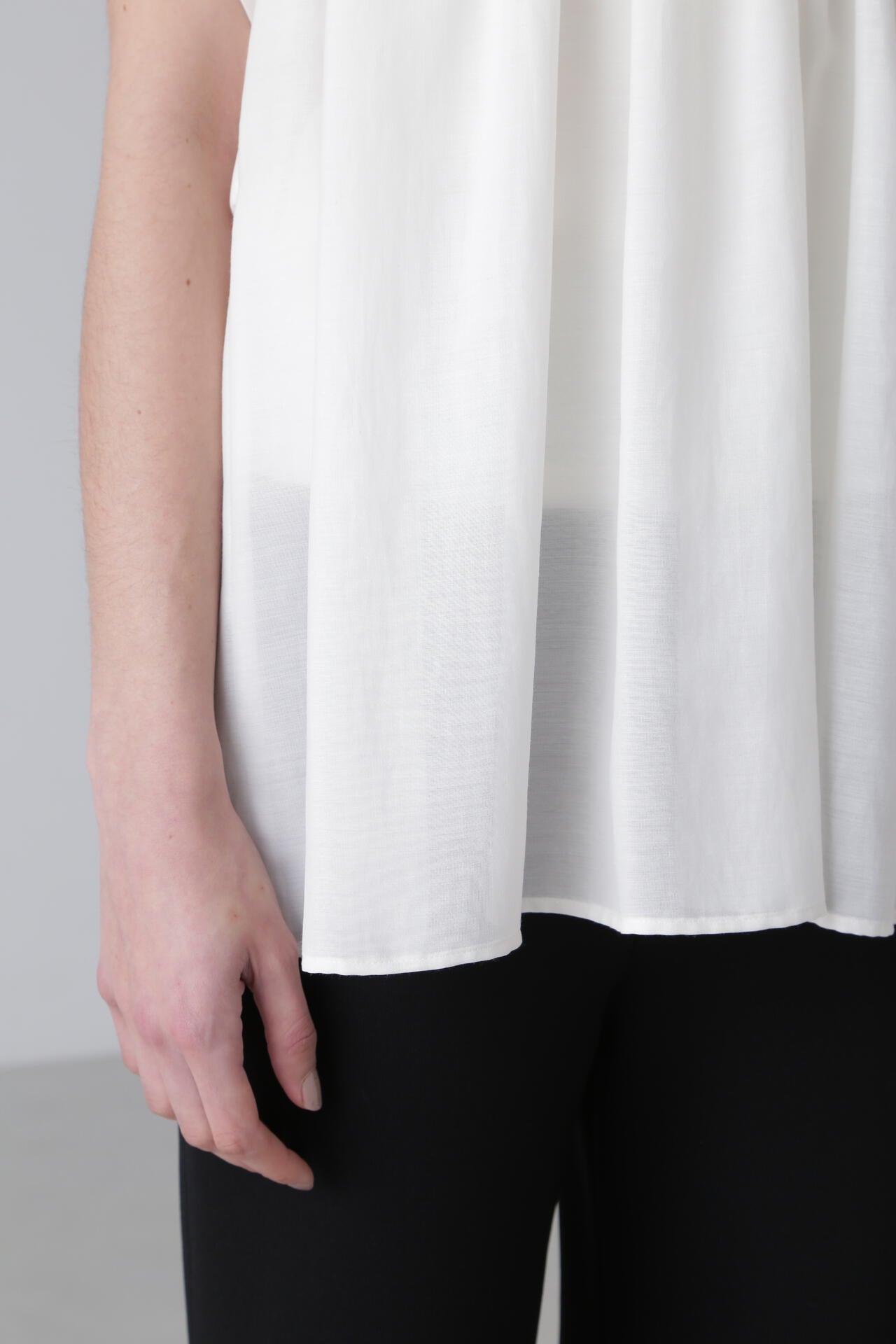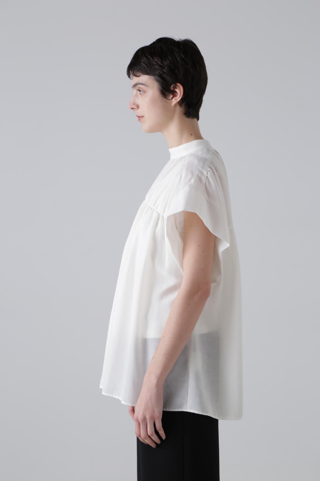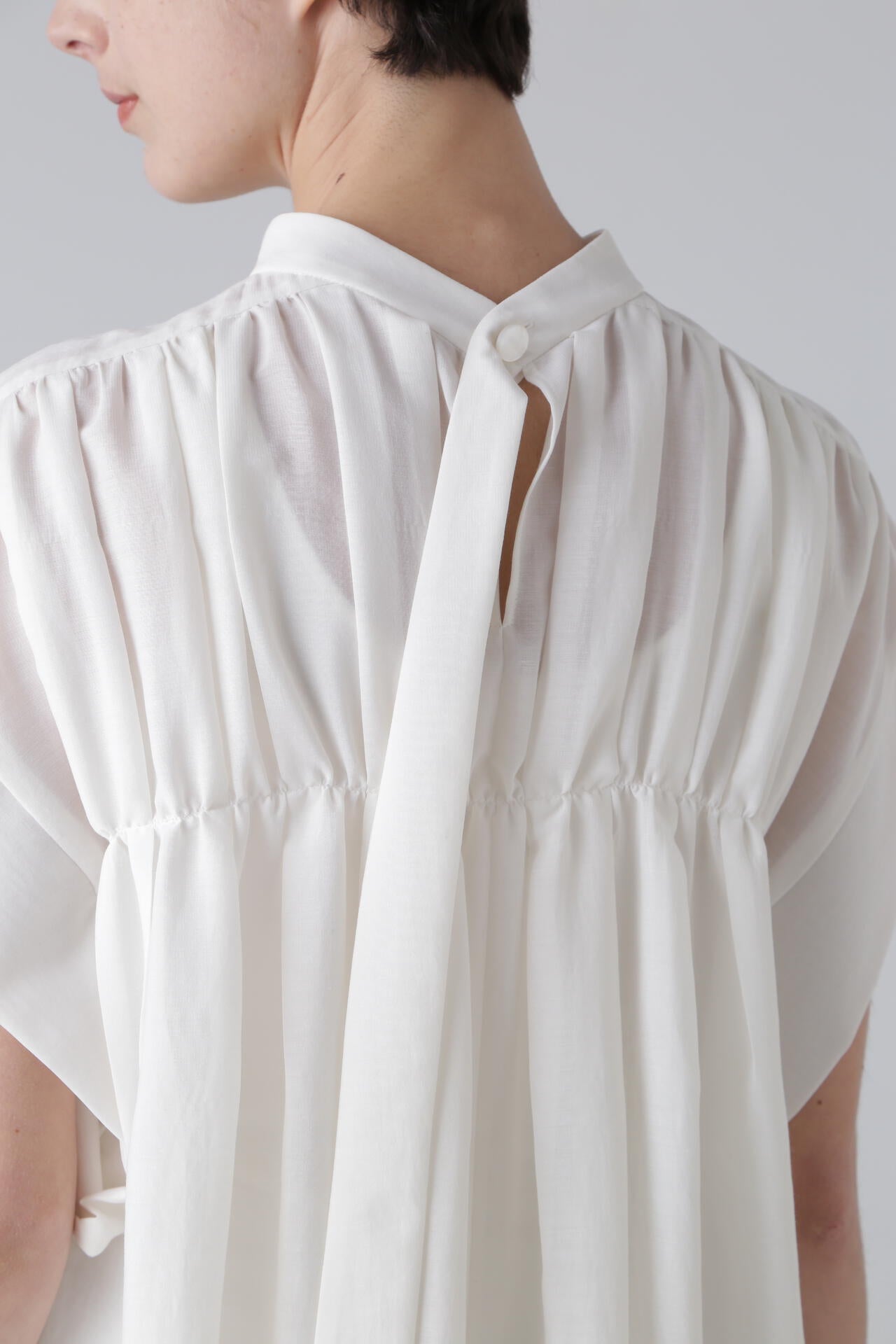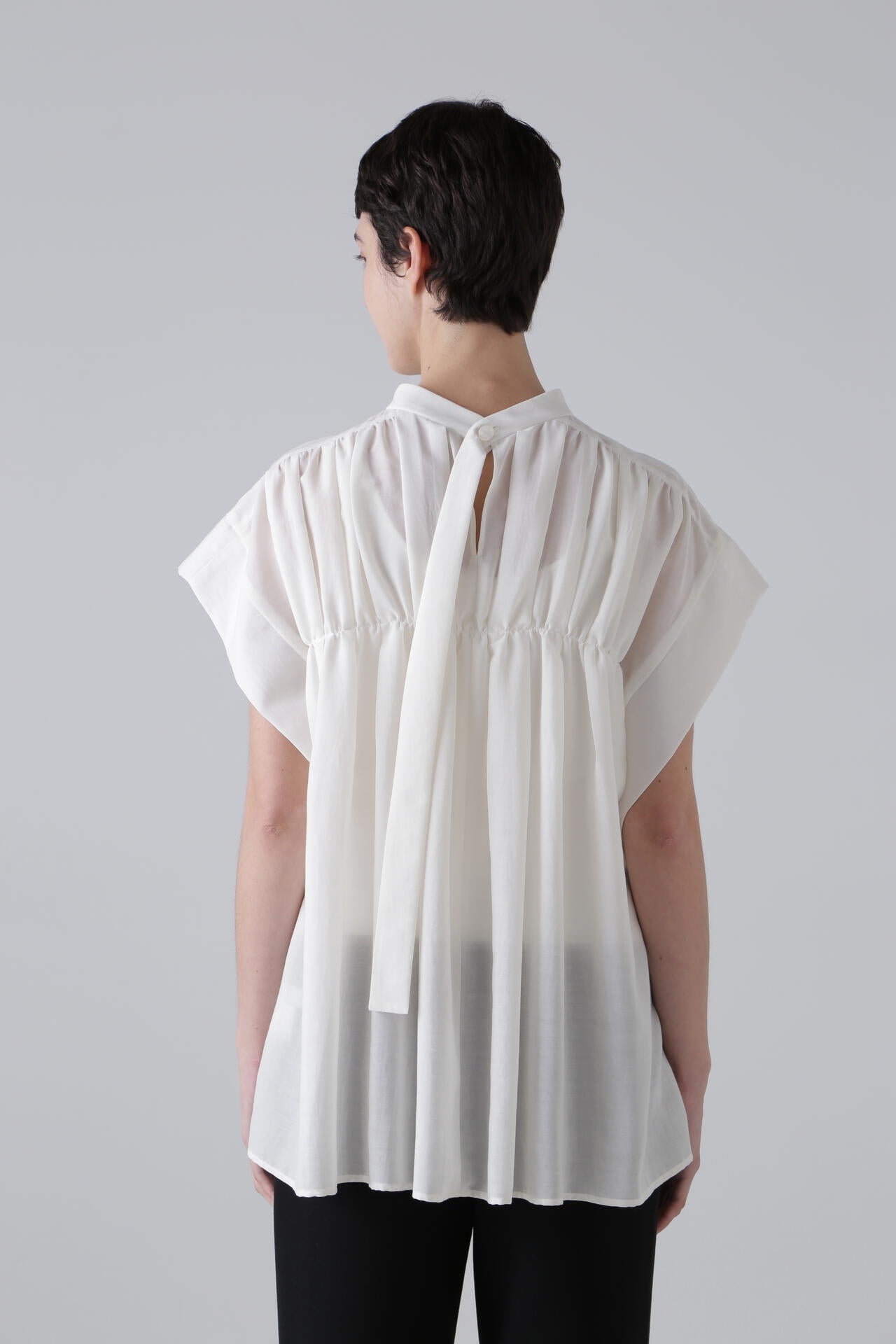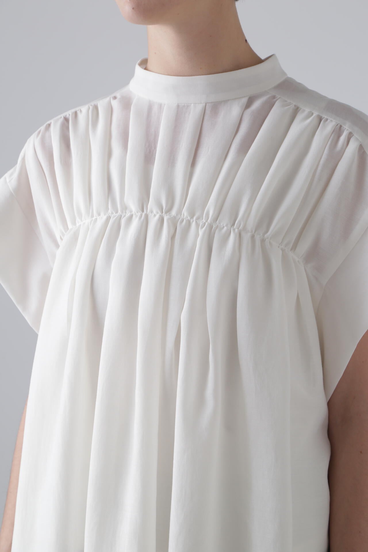 ライトで透け感のある素材に、ランダムなタックをふんだんに入れた華やかなブラウス。