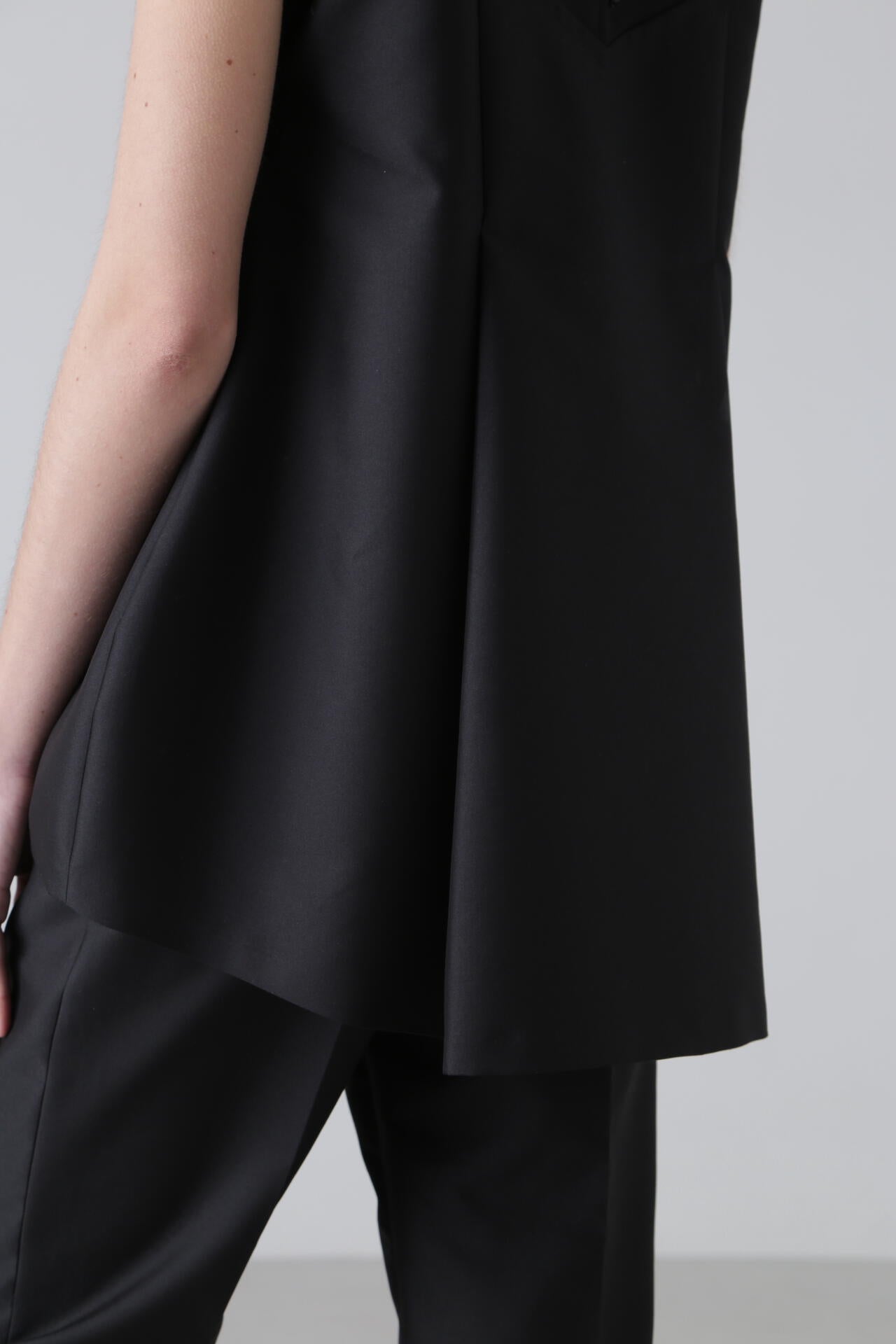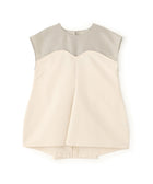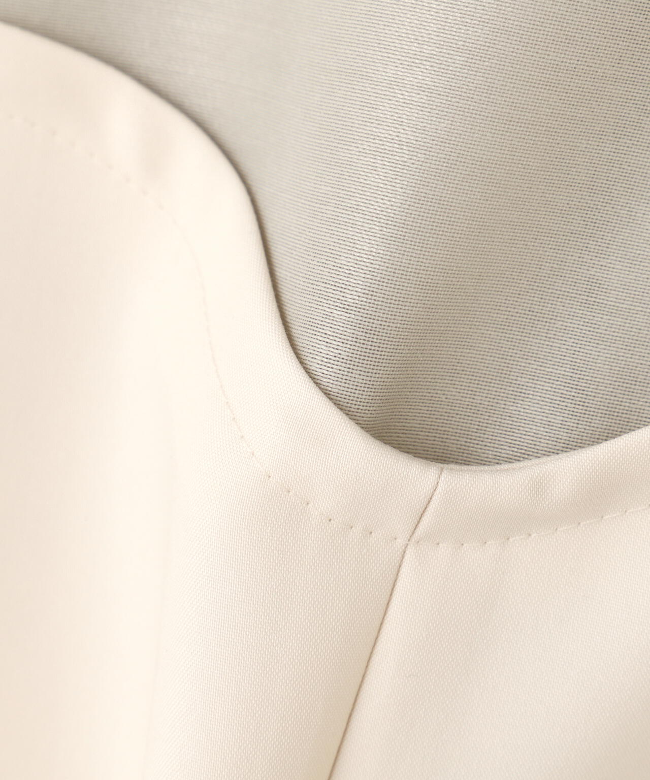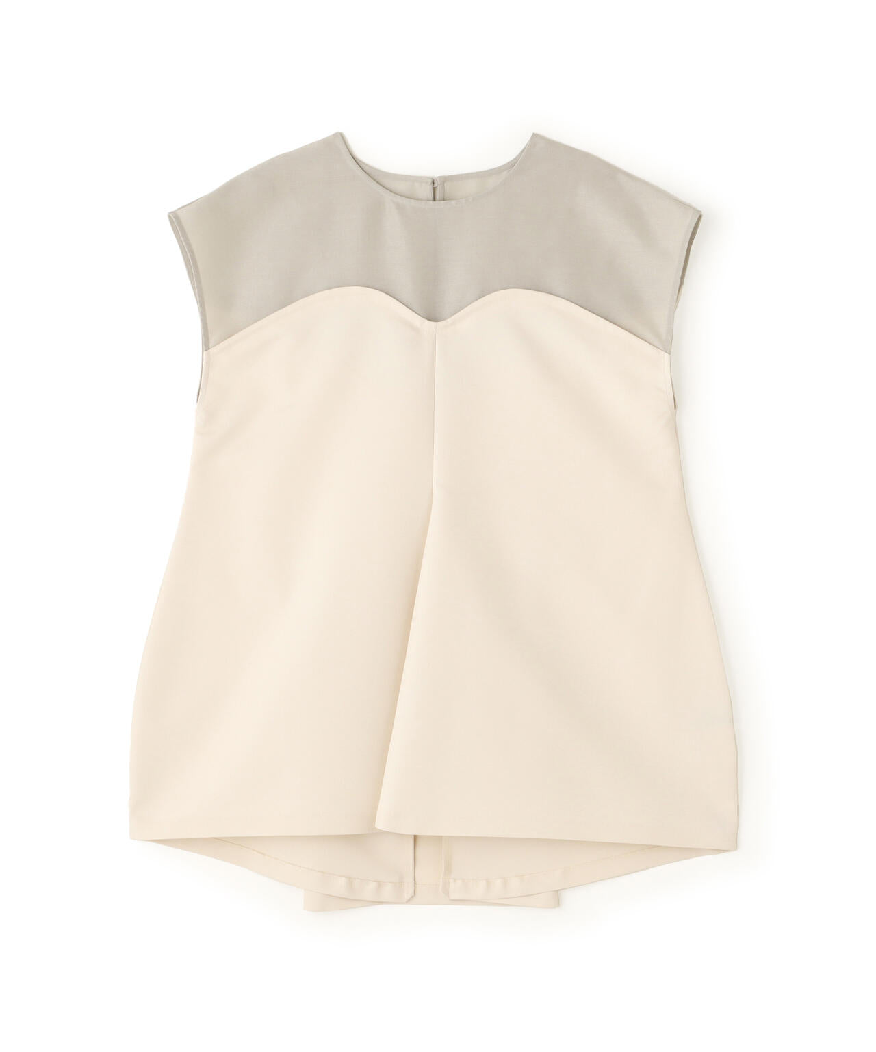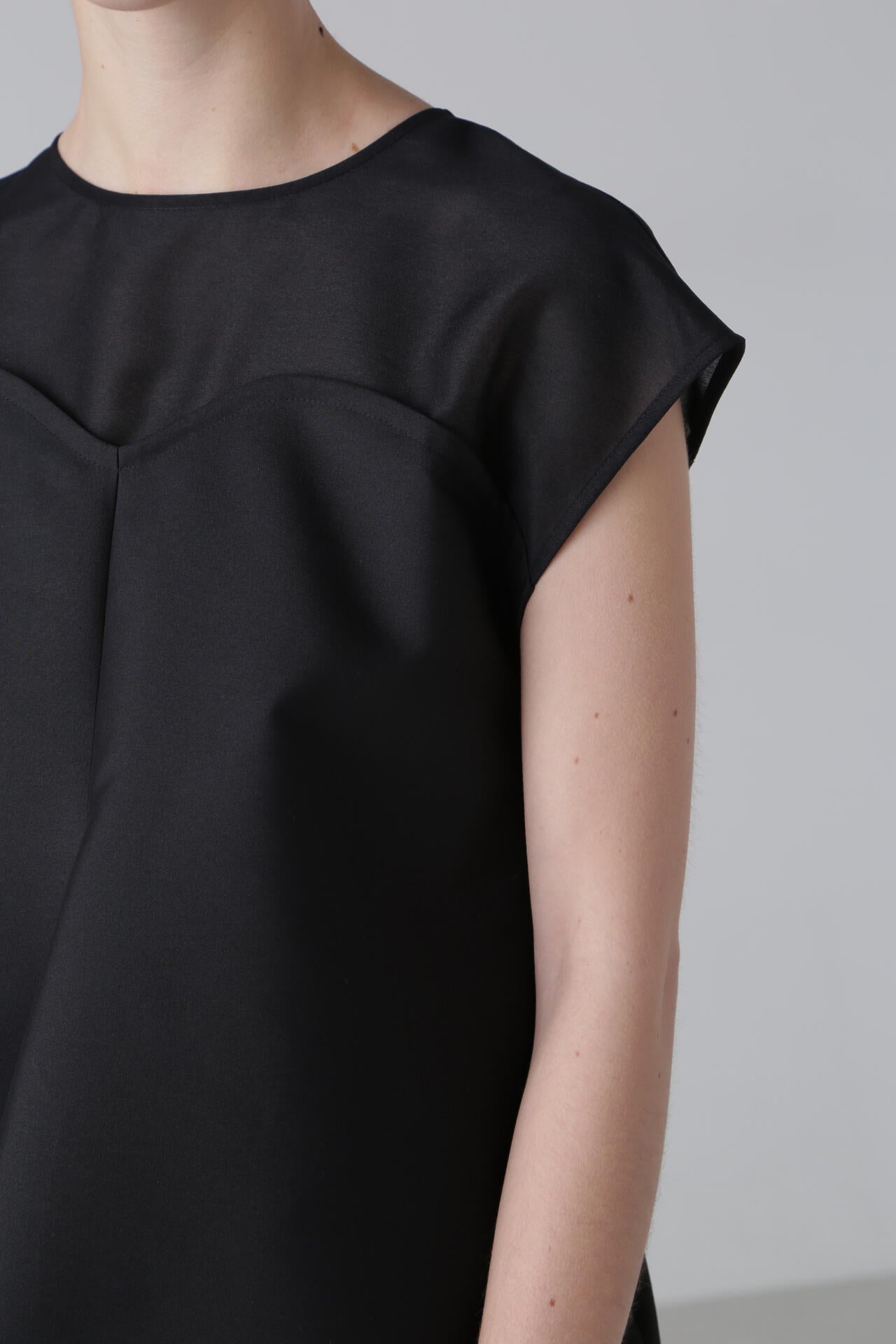 デコルテ部分を程よい透け感の素材で切り替え、ビスチェとブラウスをレイヤードしたようなデザインに仕上げました。