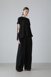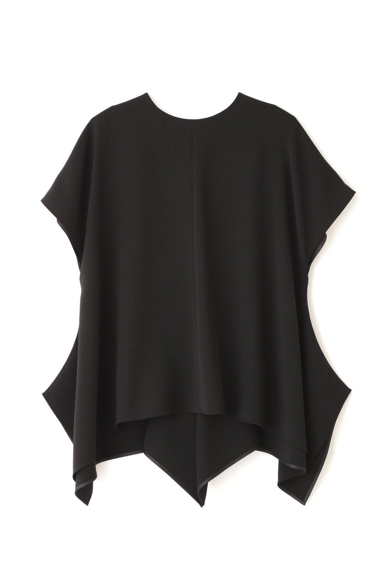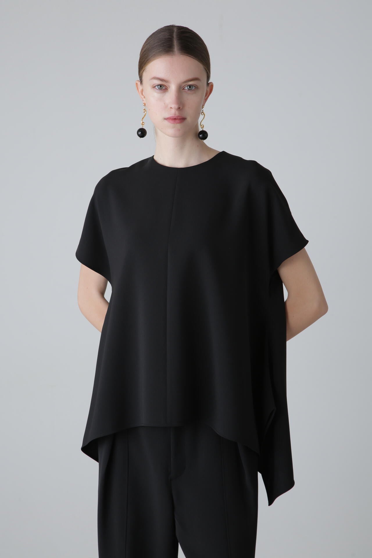 合繊素材でできた程よい落ち感のあるデザインブラウス。