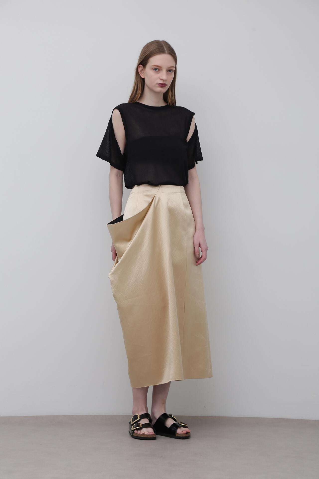 独特なネイチャー感のあるワッシャー素材に肌触りの良い芯を貼り付け張り感と落ち感を持たせたドレープスカートです。