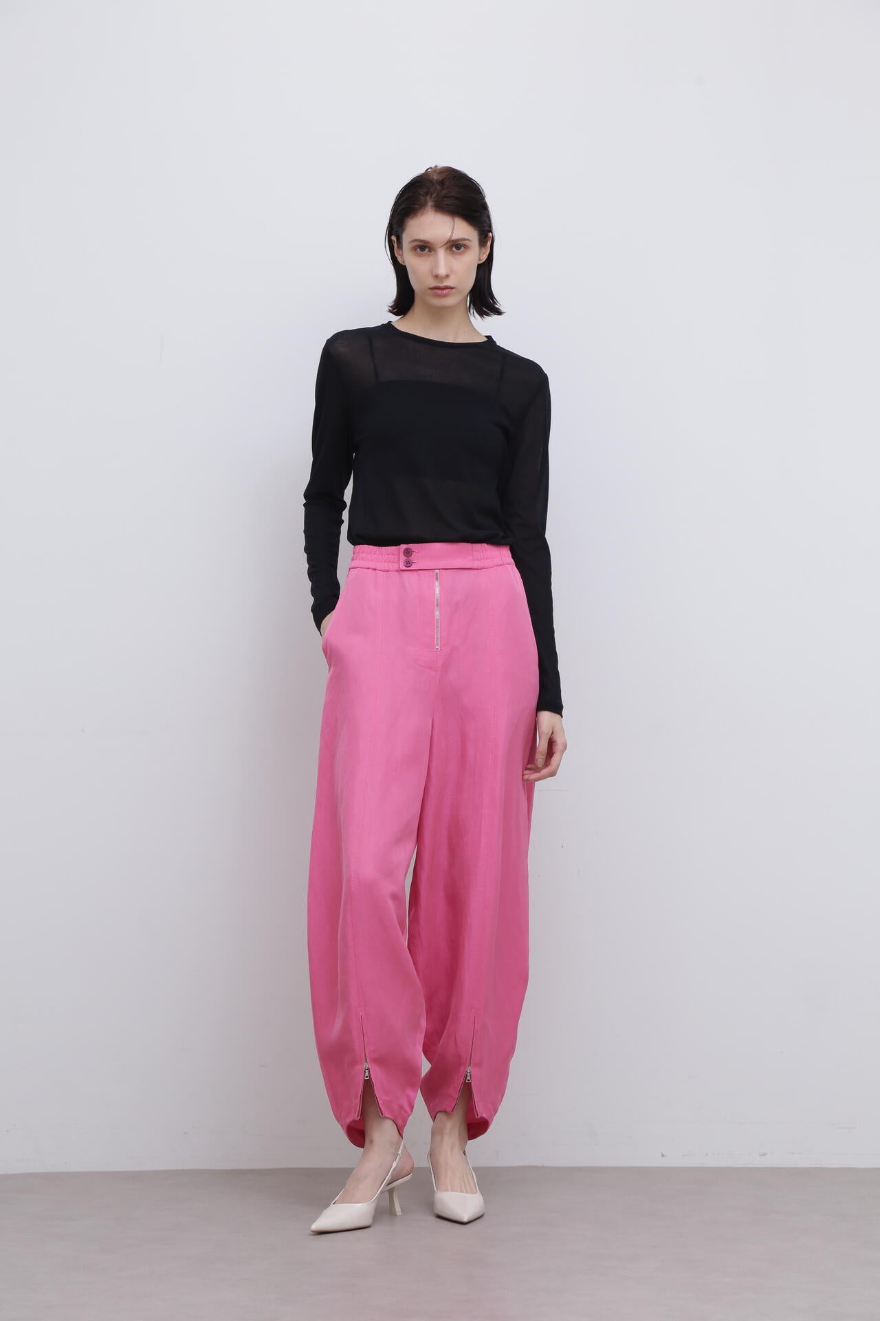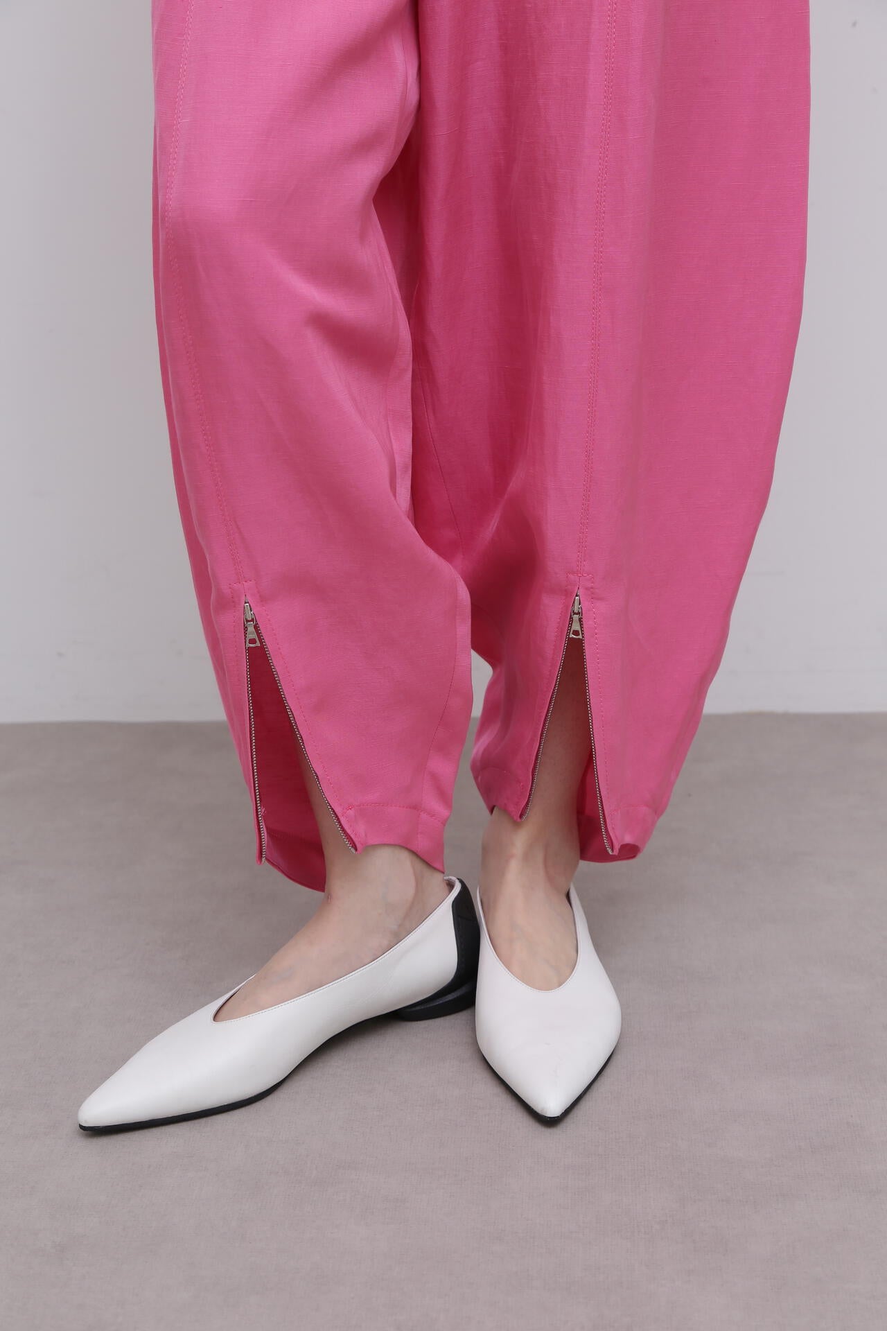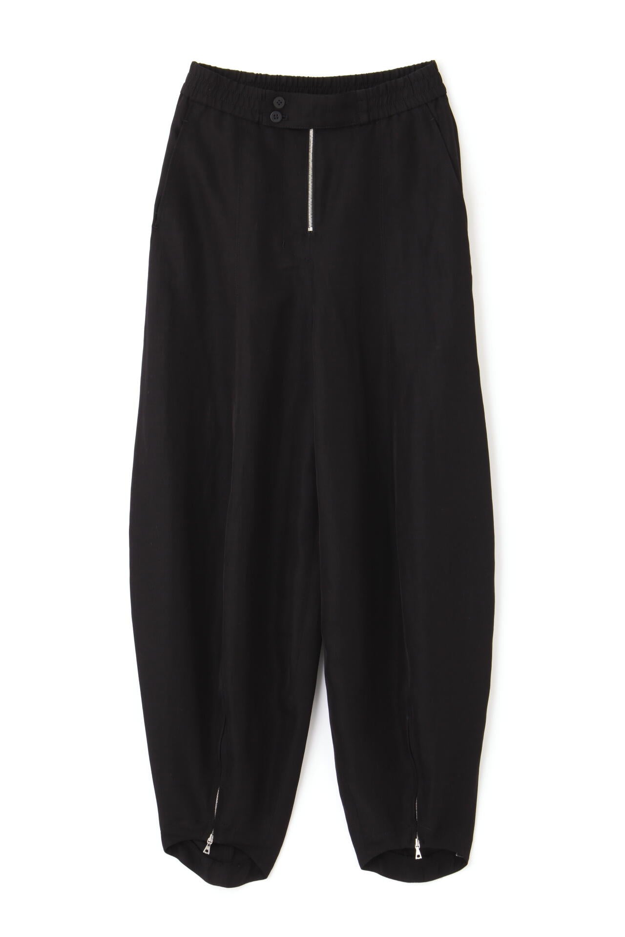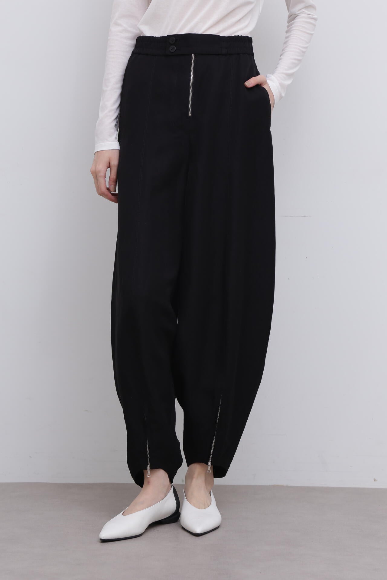 シルエットはバレル型で裾部分が前後にバナナカットになっています。前側の裾にメタルファスナーが付き開閉でスリットの様なデザインに。