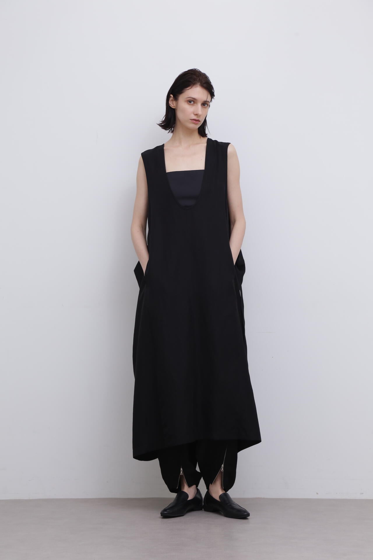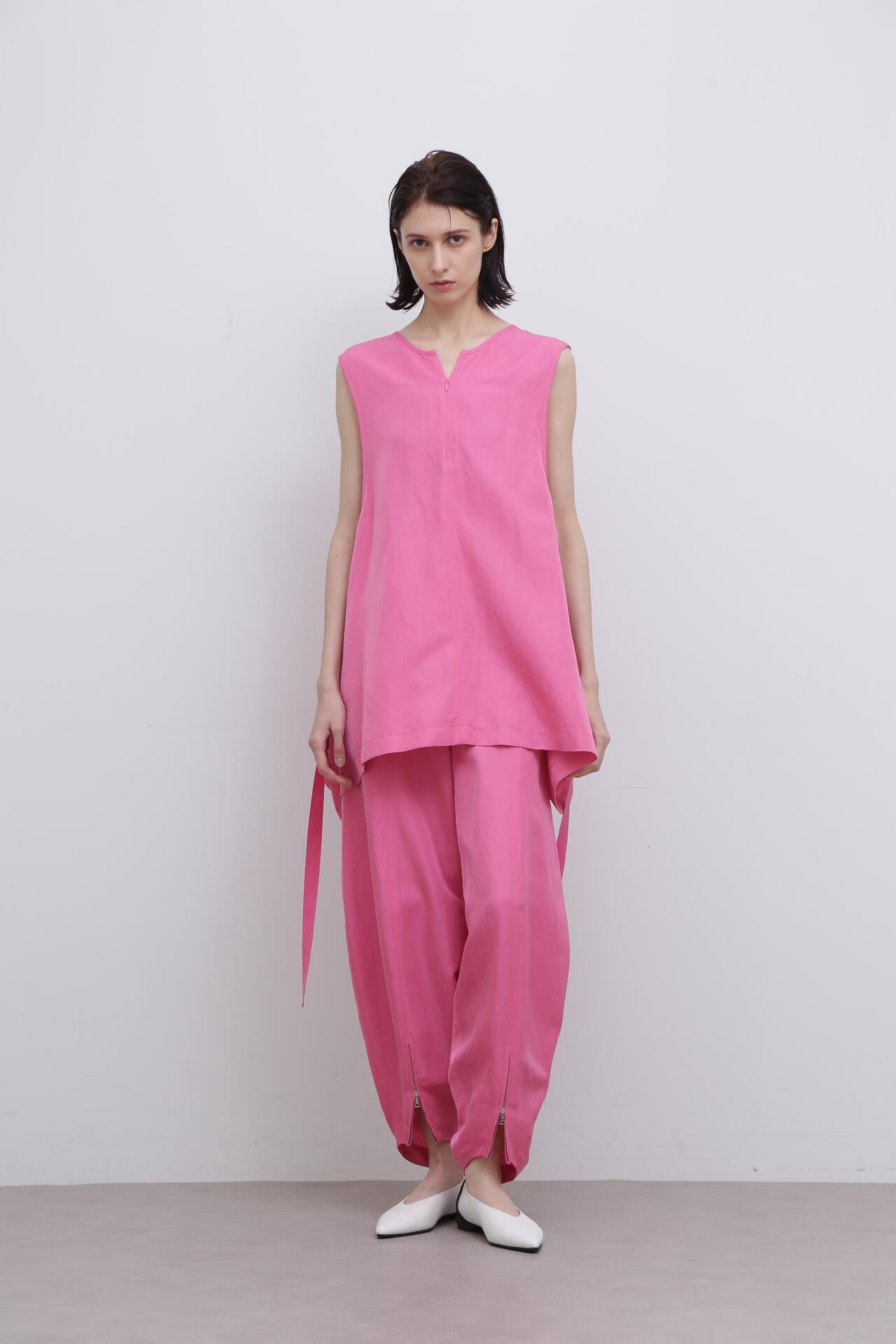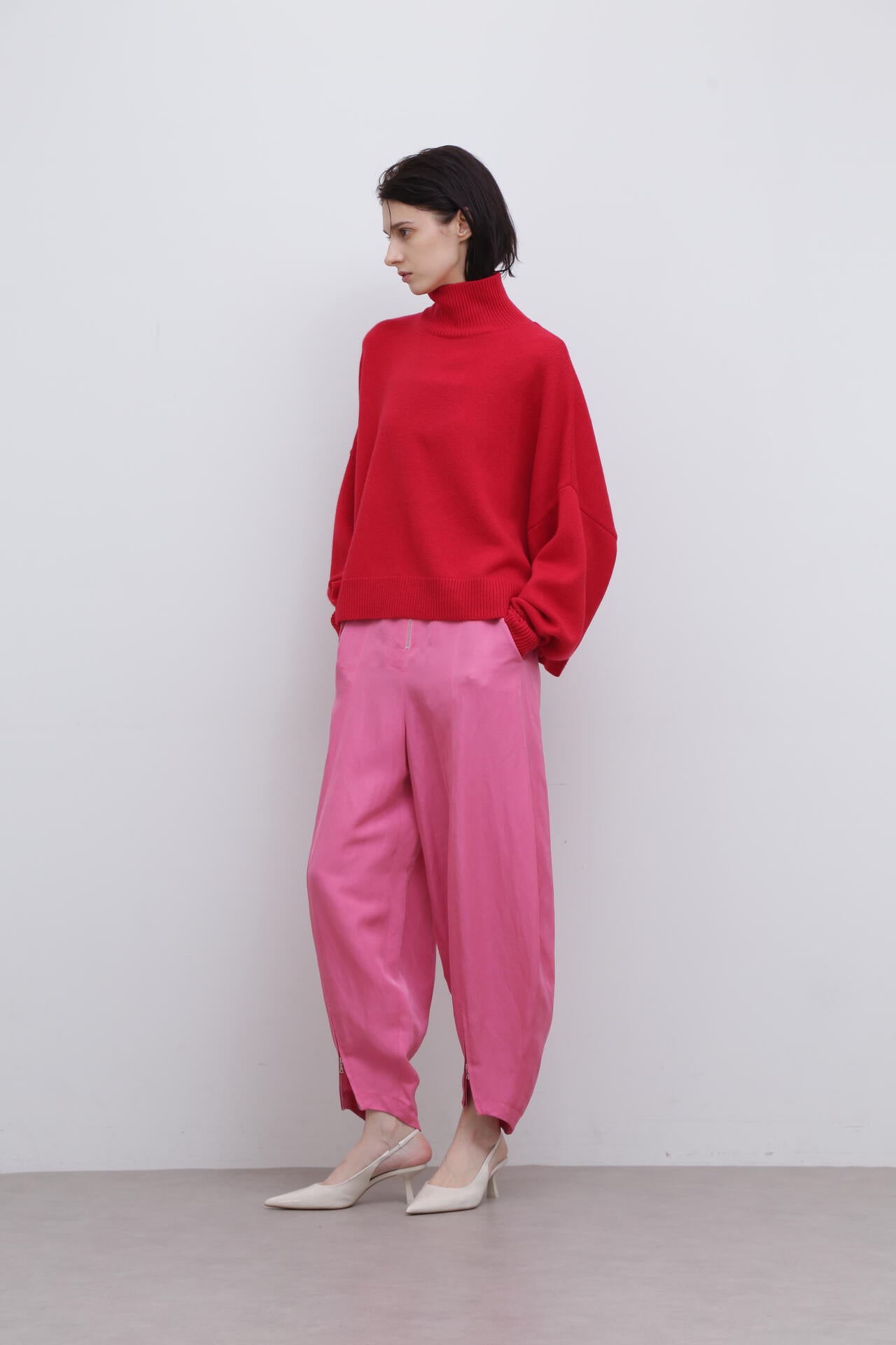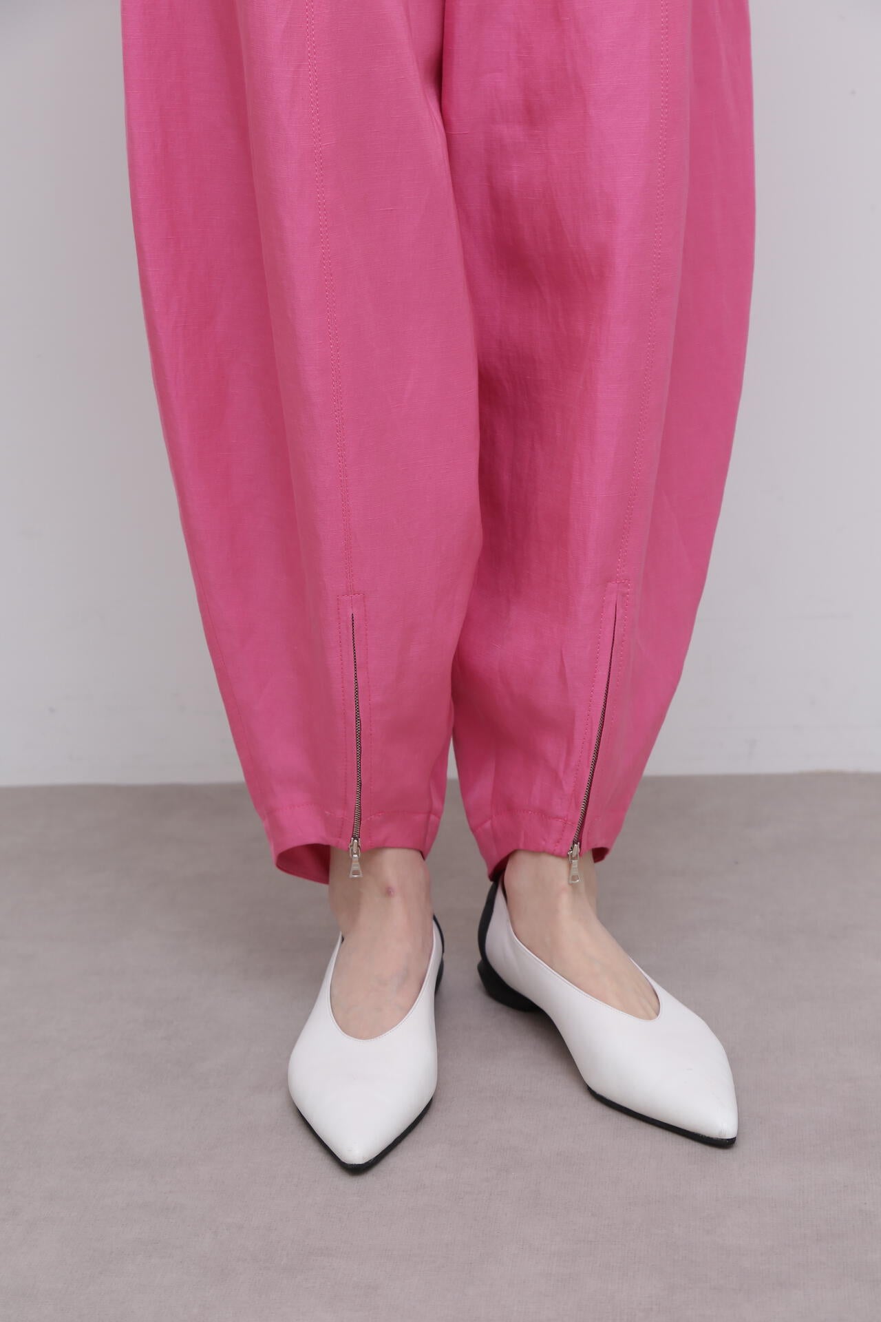 シルエットはバレル型で裾部分が前後にバナナカットになっています。前側の裾にメタルファスナーが付き開閉でスリットの様なデザインに。