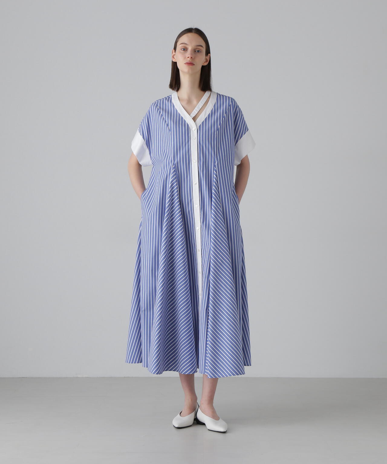 切り替えを駆使してたっぷりフレアーを入れた、ストライプのシャツ地ドレスです。