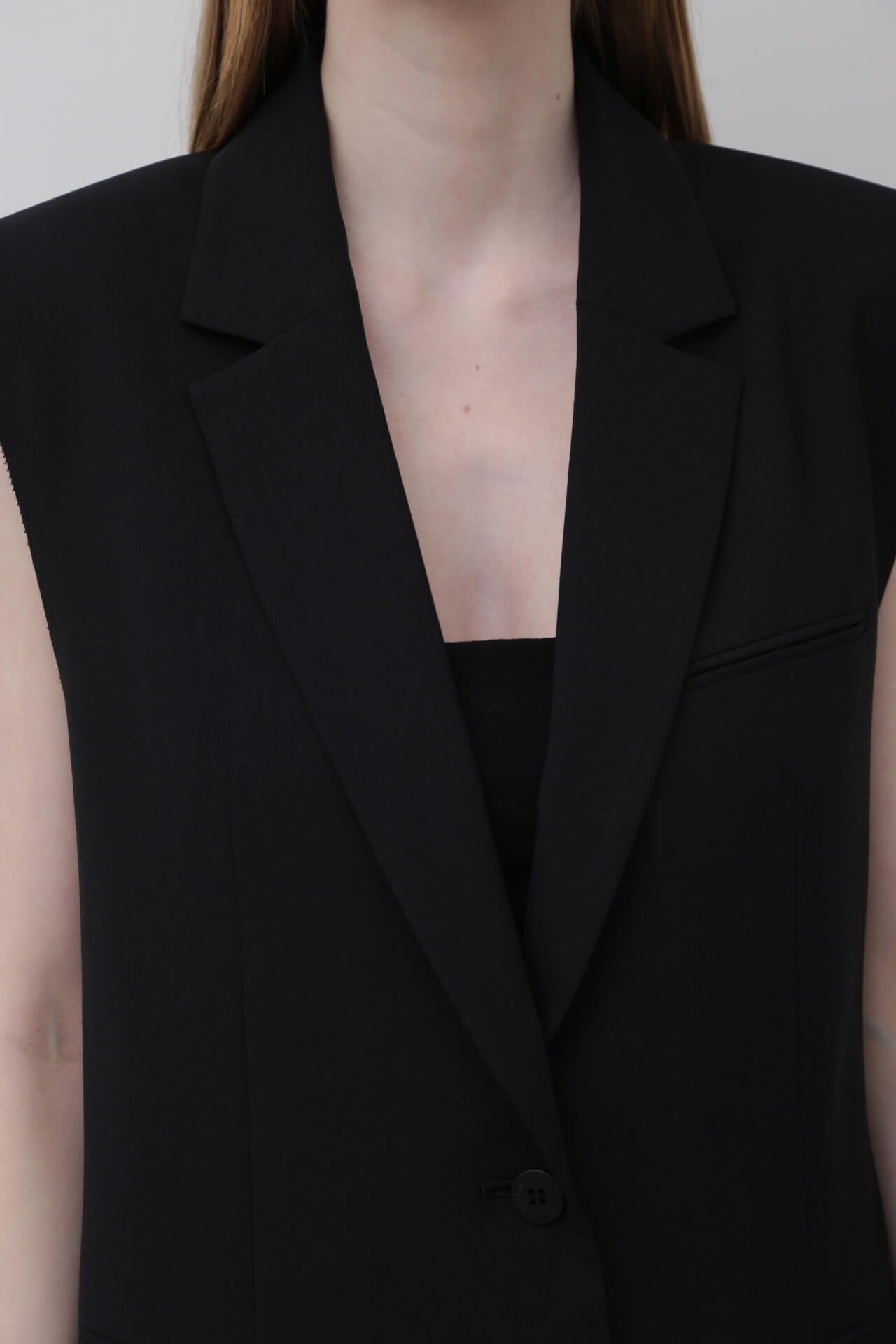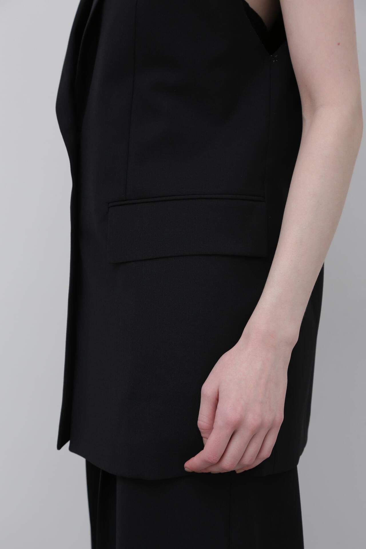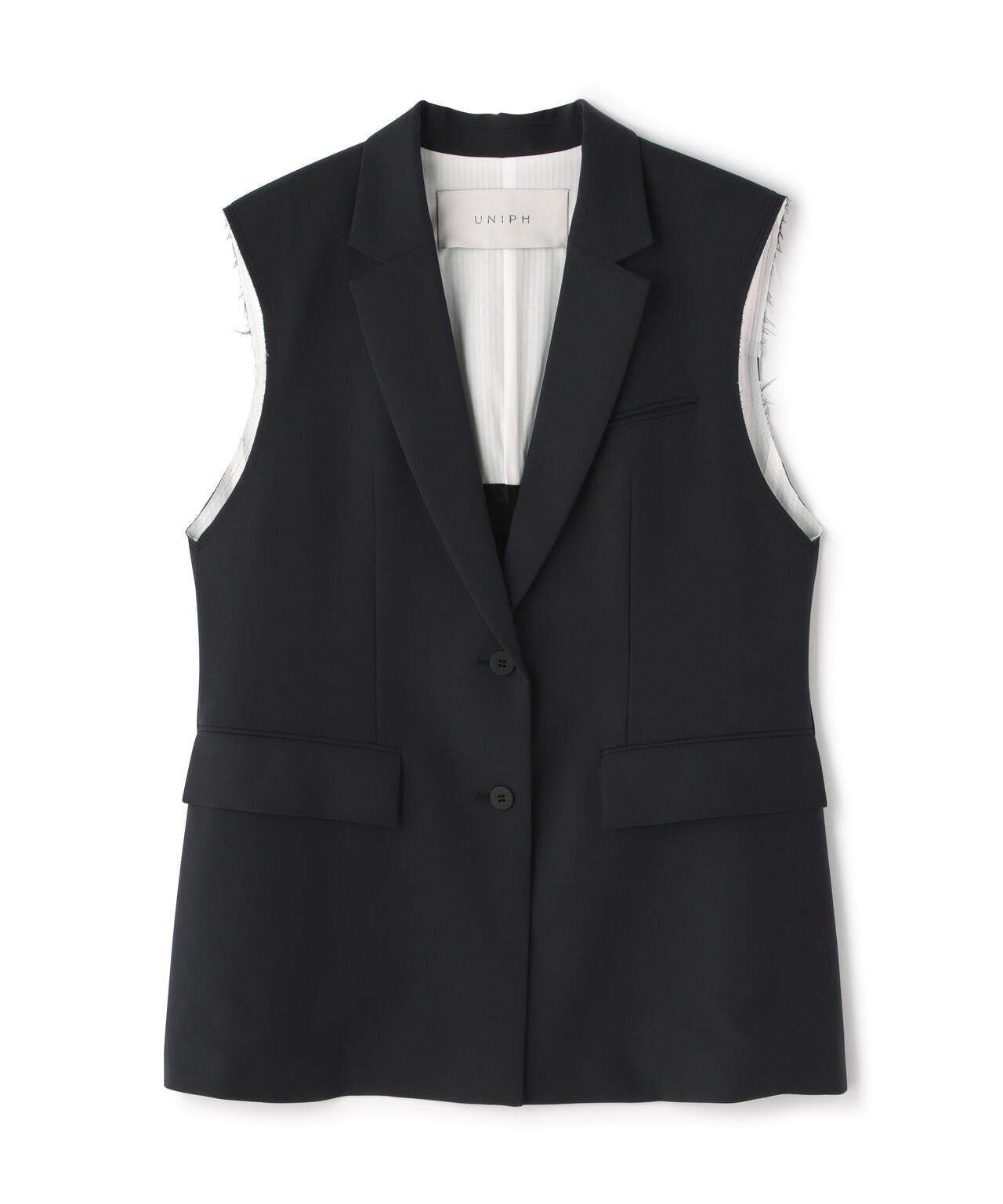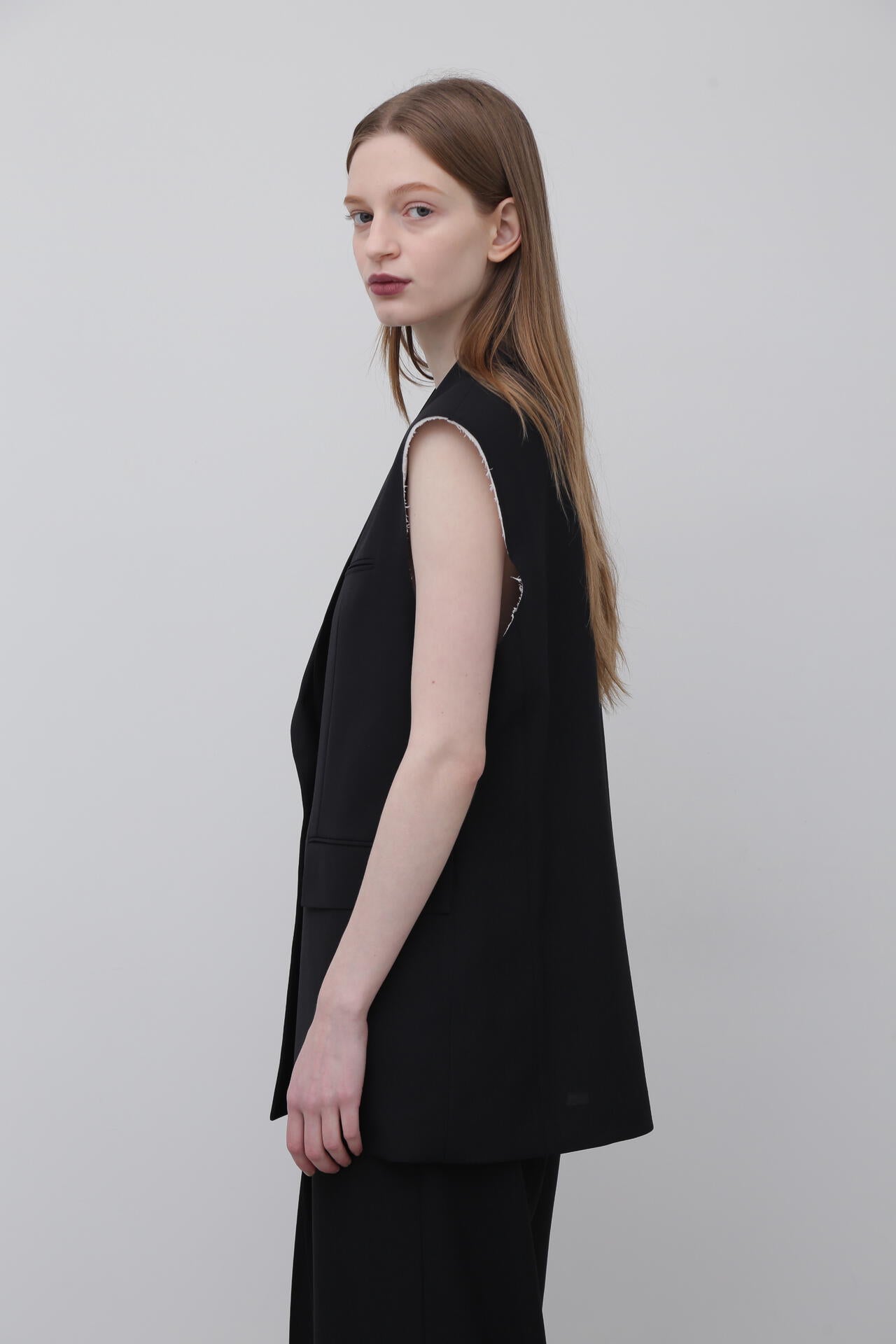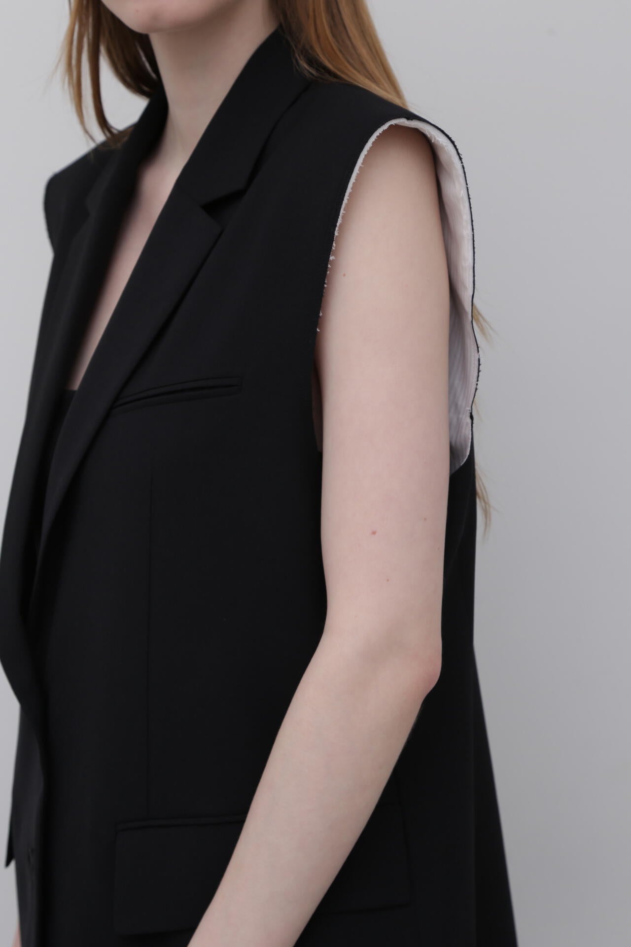 やや着丈の長いテーラードカラーのジレジャケットで、アームホール部分が断ち切りのデザインになっています。