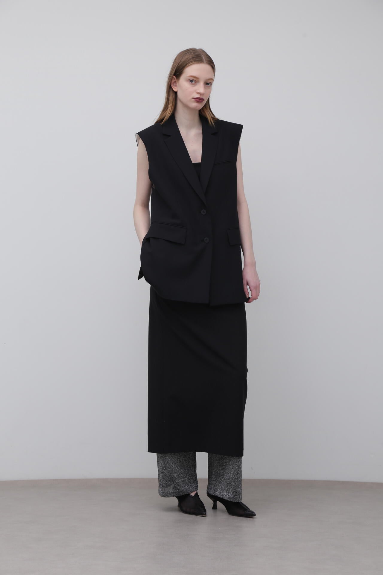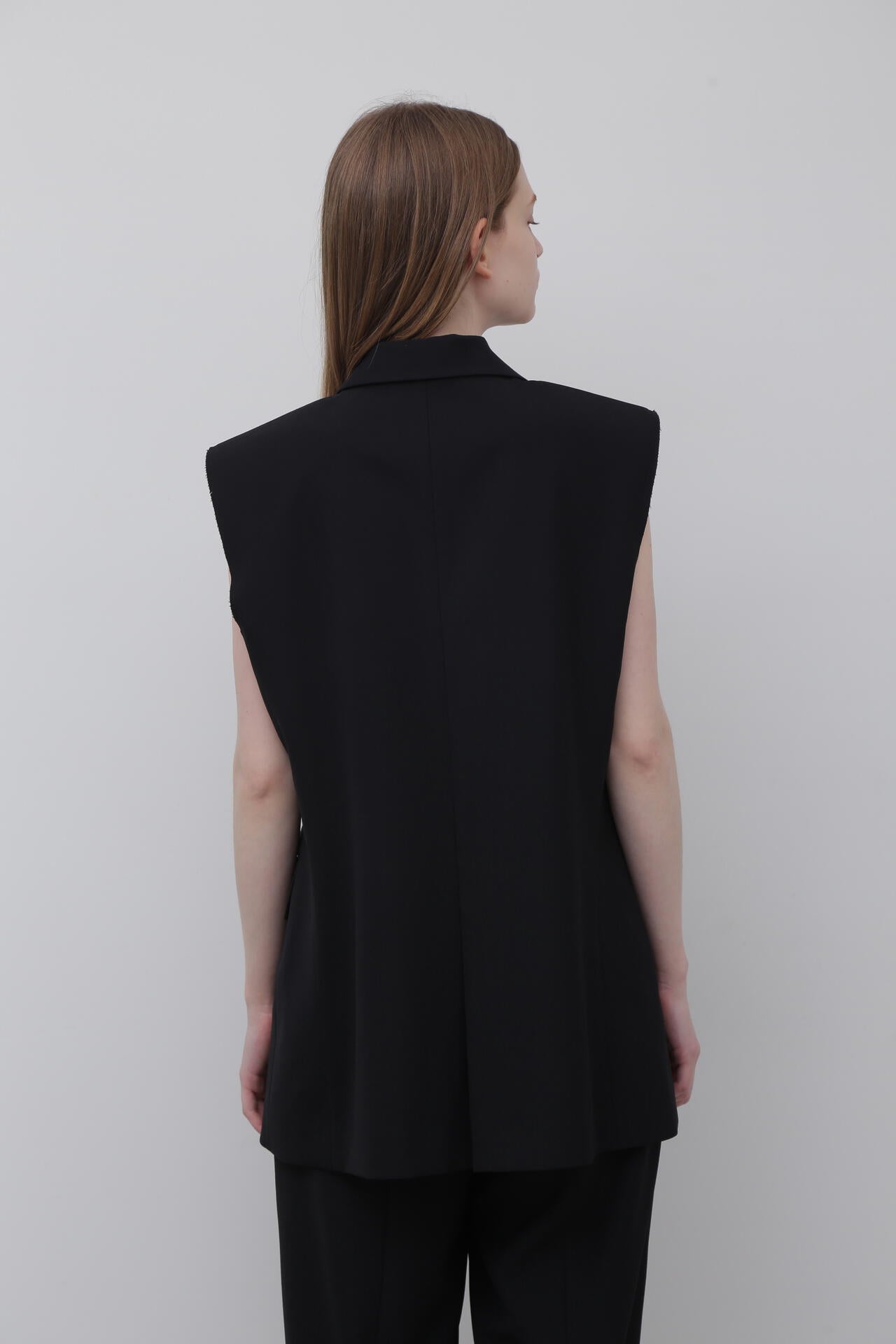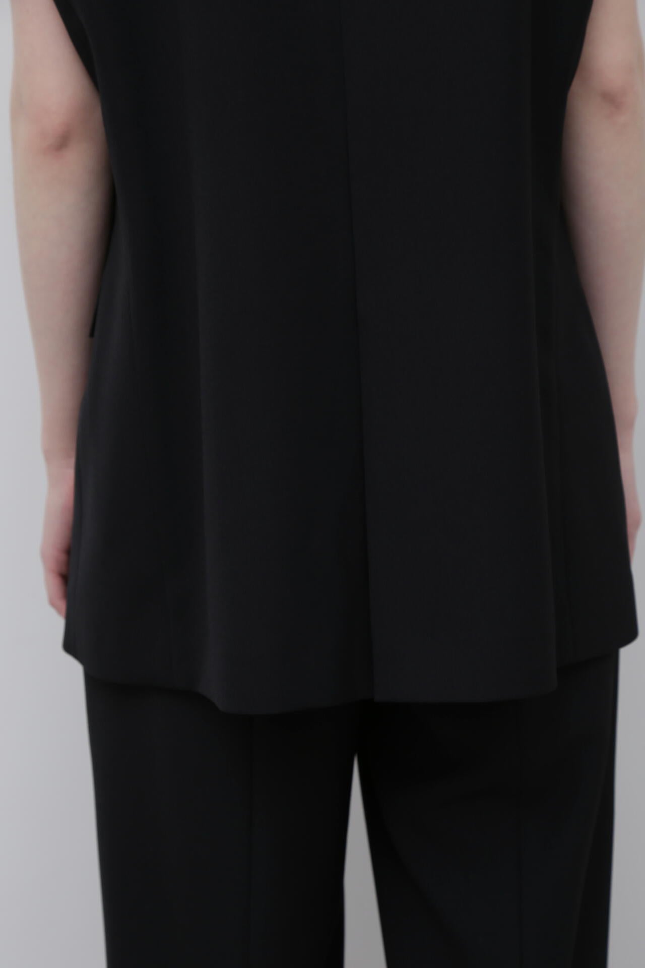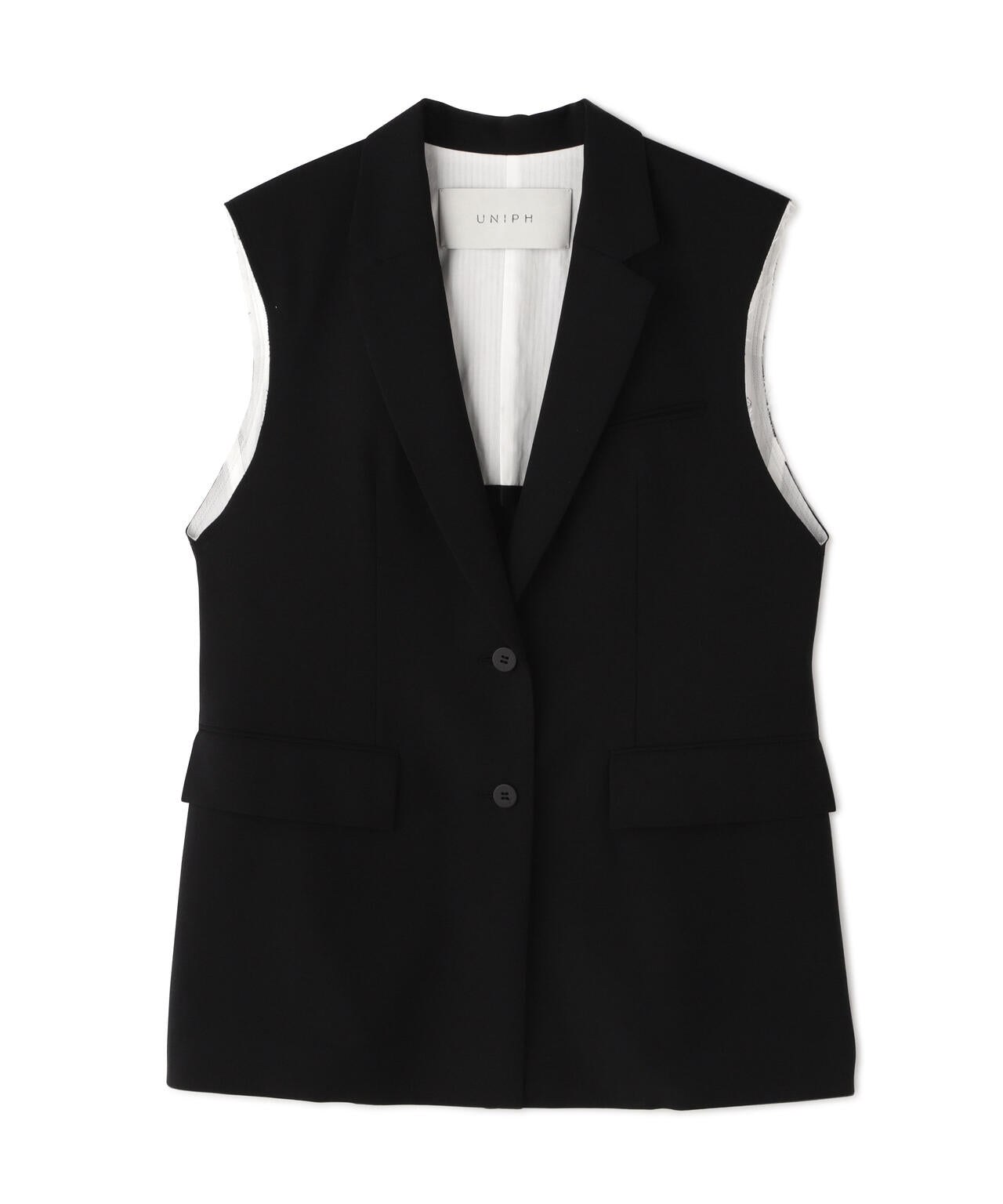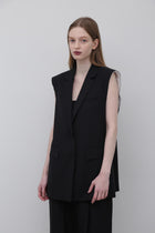 やや着丈の長いテーラードカラーのジレジャケットで、アームホール部分が断ち切りのデザインになっています。