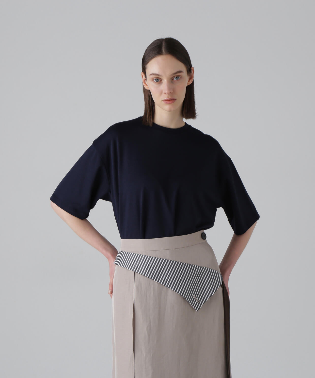 ドライタッチなレーヨンの糸を使用したストレッチポンチ。ドライタッチな糸の特徴による清涼感、シルケット加工による光沢、適度なハリ感が特徴の素材で仕立てました。