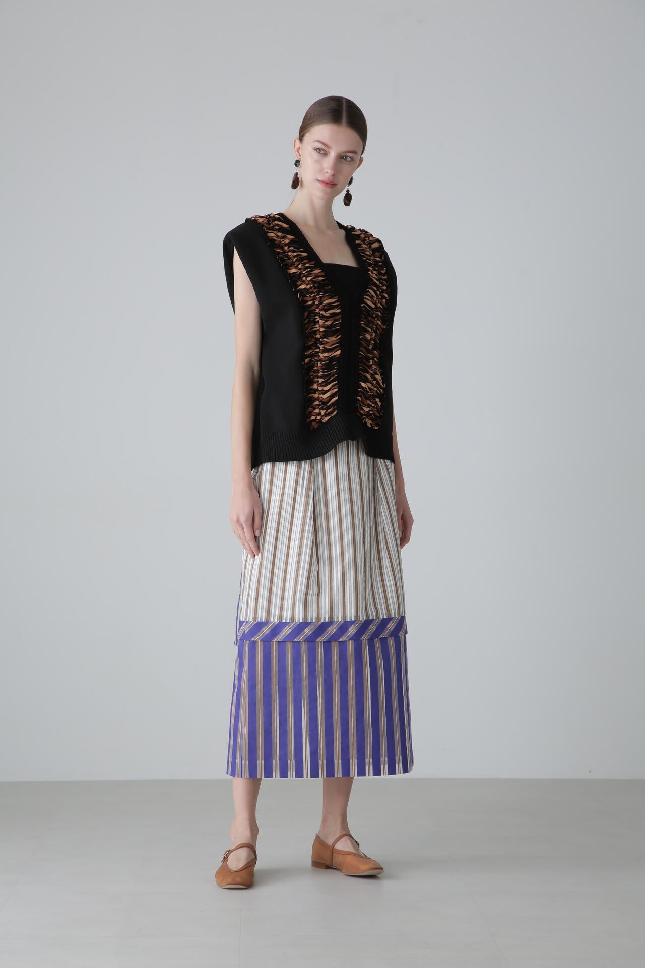 フロントと襟ぐりにテープヤーンを使った、編み地が印象的なニットベストです。