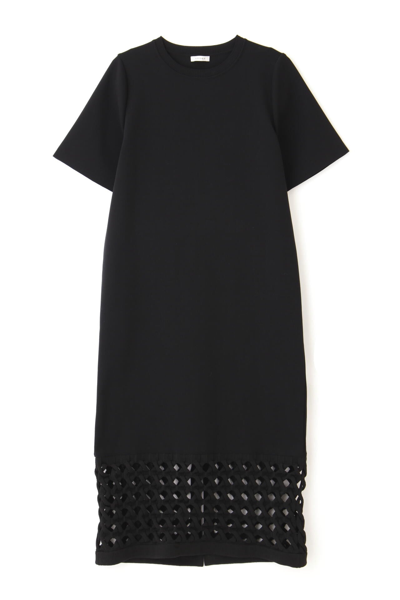 7Gオンリーの特殊な自動機で編んだ、ケーブル風メッシュが裾に入ったニットワンピース。