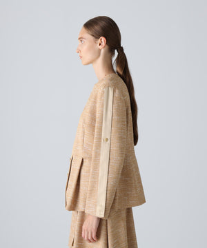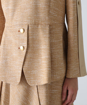 ツイーディーな素材の厚さを抑えるため、ウールの紡毛を使用せず、ポリエステルのスラブ糸とコットンで軽く、ライトに織り上げた素材で仕立てました。