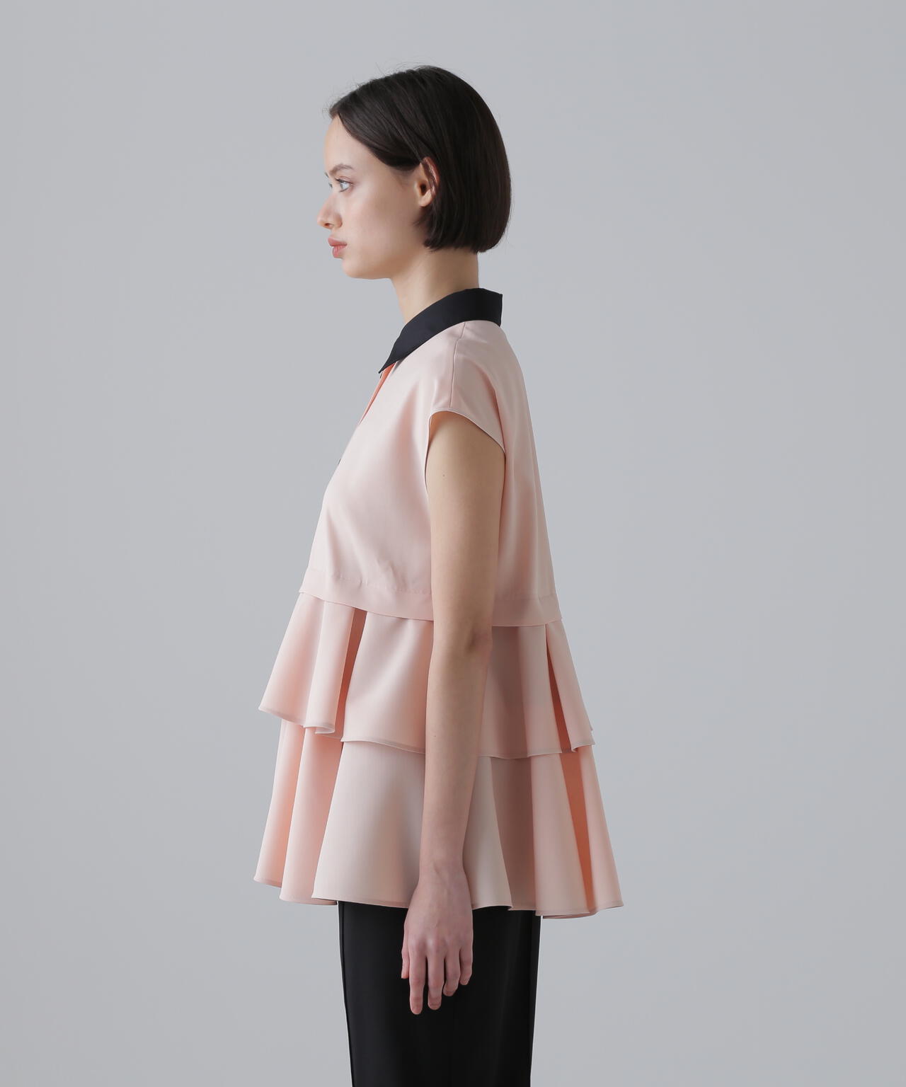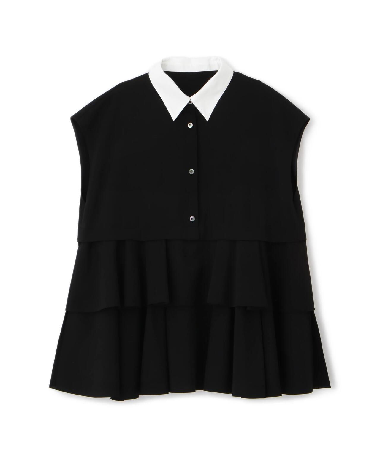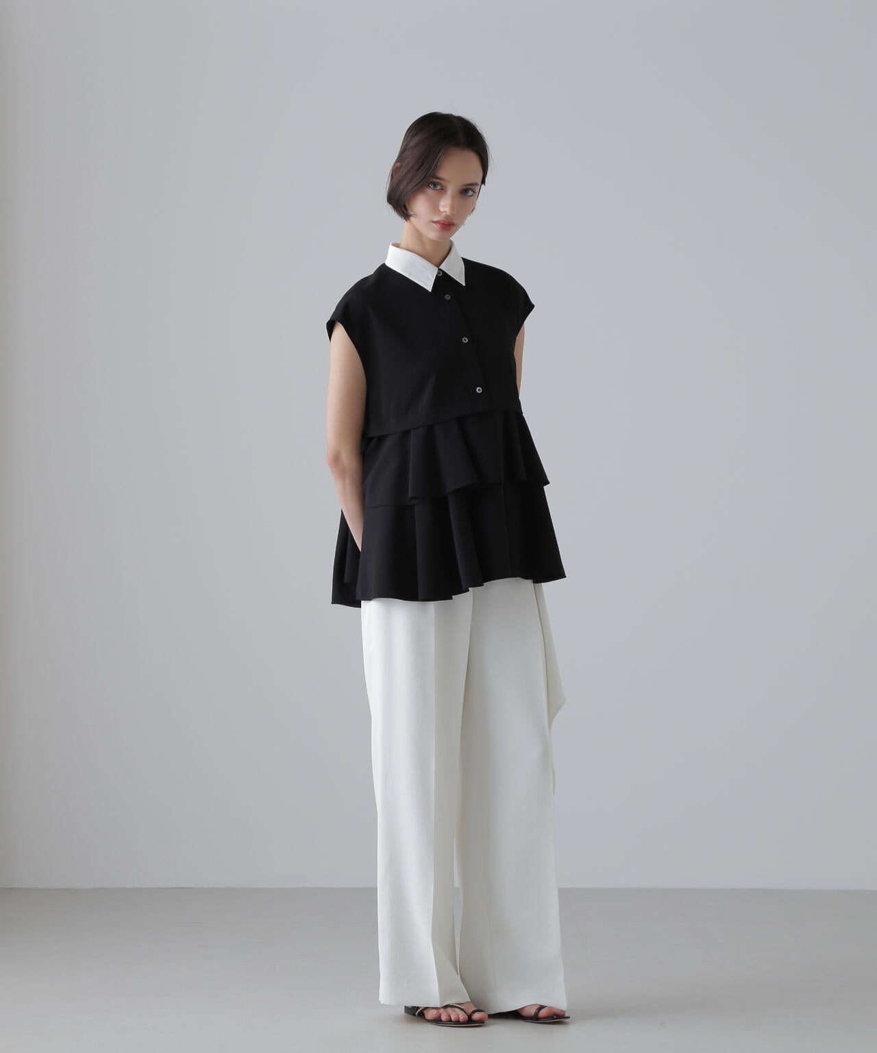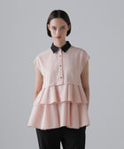 身頃に入ったティアードペプラムがデザインポイント。配色の襟は取り外し可能で様々なスタイリングを楽しめる仕様に。