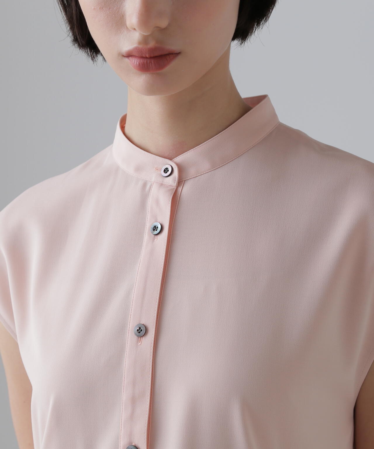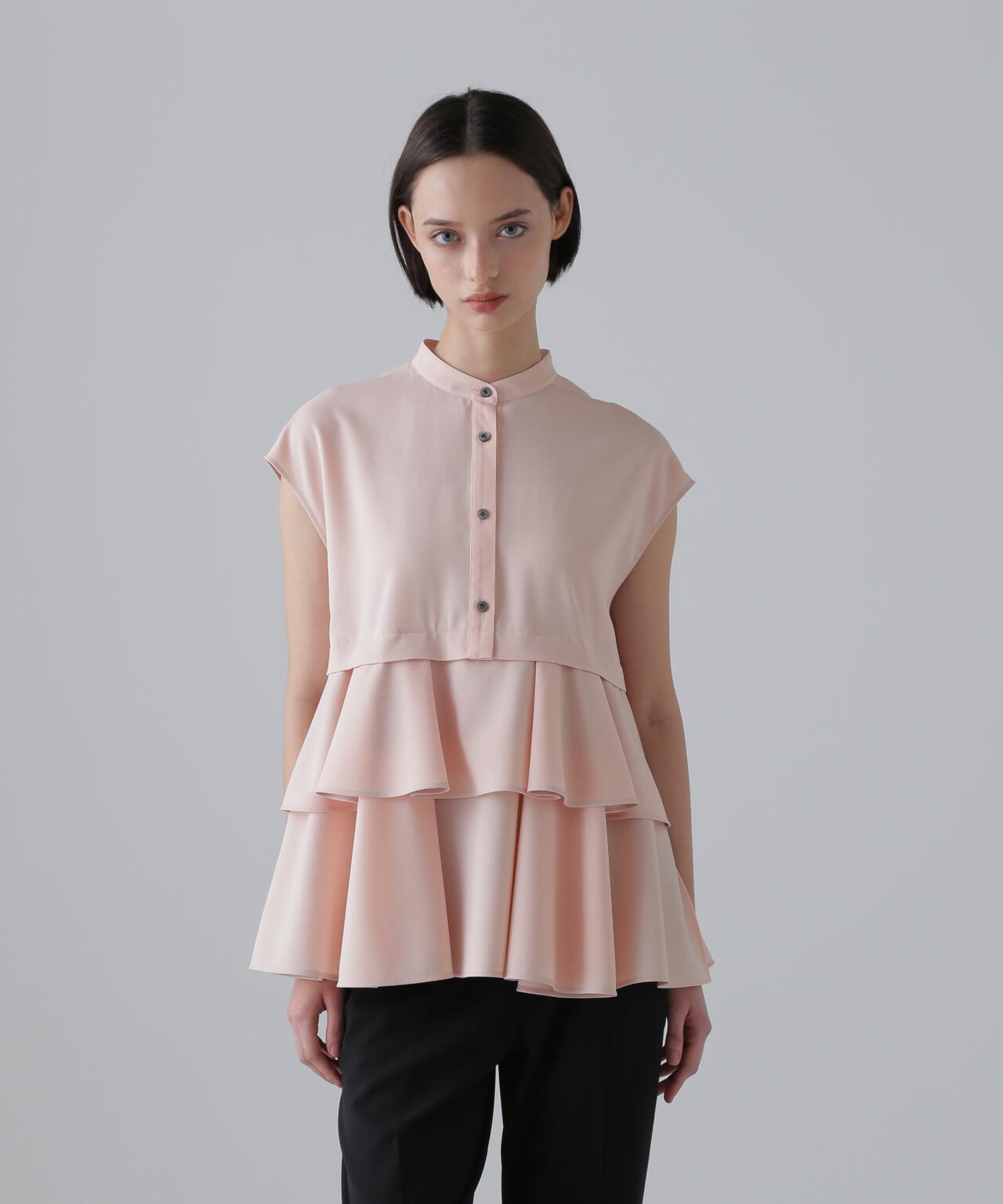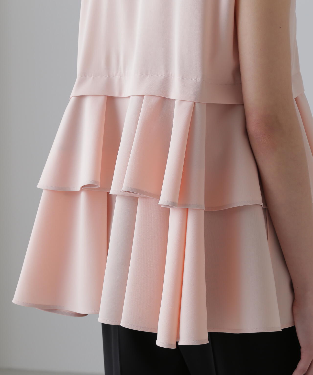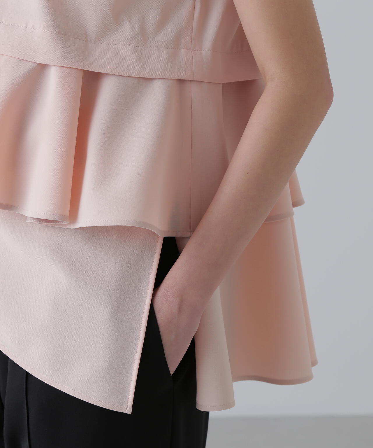 軽くドライなタッチが特徴の合繊素材でできたペプラムブラウスです。