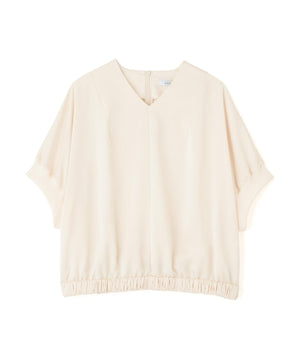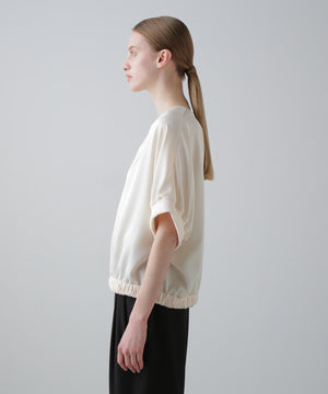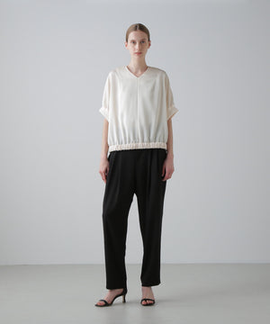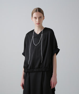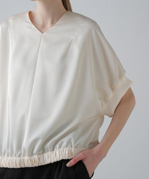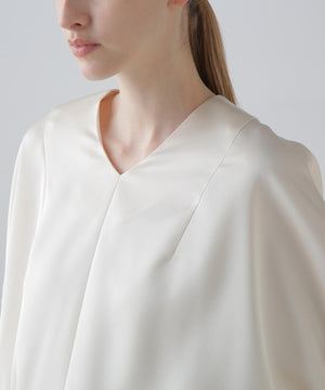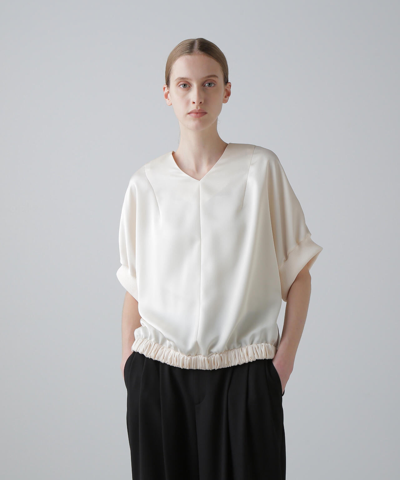 程よい光沢のサテン素材のブラウス。素材の落ち感を活かした、さらりと着られる1枚です。
