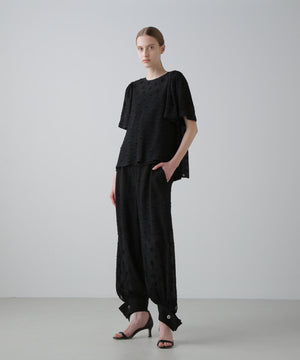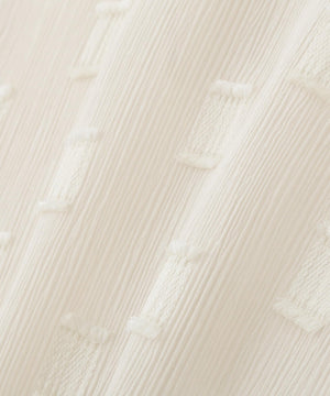 加工ではなく糸の撚糸と縮率差で楊柳の様なタテ畝を出し、光沢のあるポリエステル糸でアクセントのカットモチーフを表したジャカード素材です。