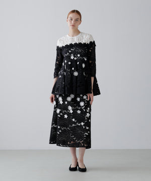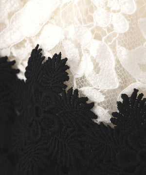 ポリエステル糸をベースに太番手のコットン糸でモチーフを編んだ、大胆な柄のブラックレース素材と、ナイロンをベースにレース編の中でも非常に希少性の高いリバー織機を使用しすることで、大胆なモチーフに繊細で複雑なチュール組織を組み合わせたホワイトレース素材で仕立てました。