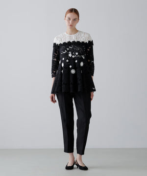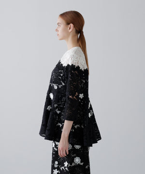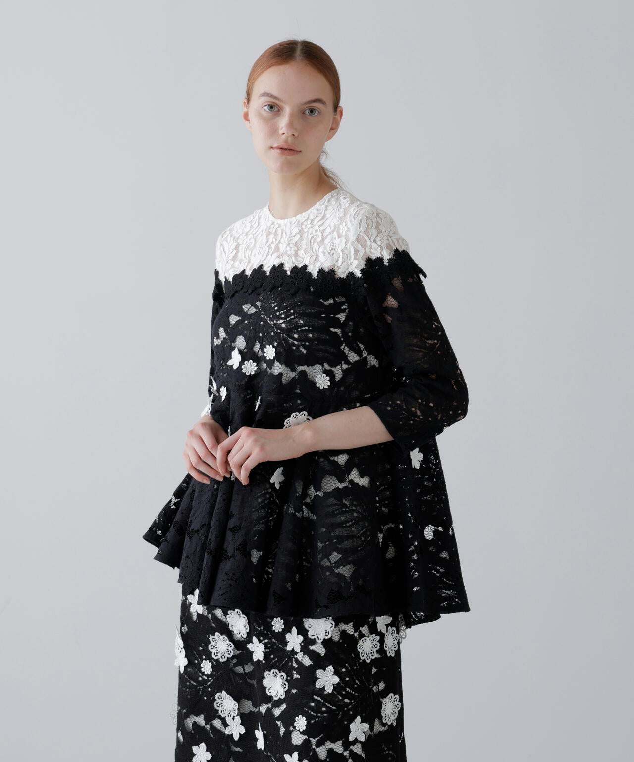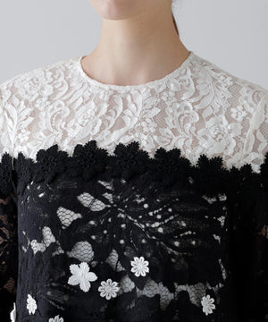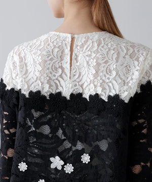 柄の違う2種類のレースをバイカラーではぎ合わせたフレアーシルエットのフェミニンブラウスです。