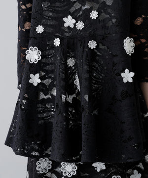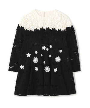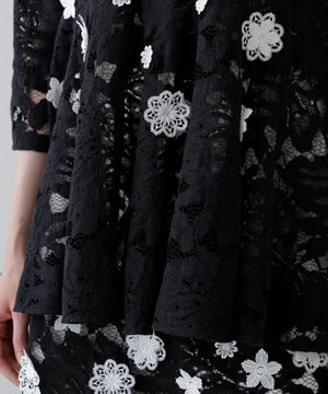 レースの切り替え位置にケミカルレースのテープをたたき、前後見頃には手付で様々な種類のケミカルレースを散らせた手の込んだ一着です。