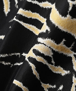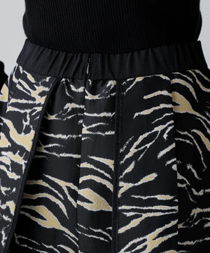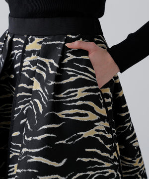大胆で構築的なフォルムが魅力のゼブラジャガードタックフレアスカート