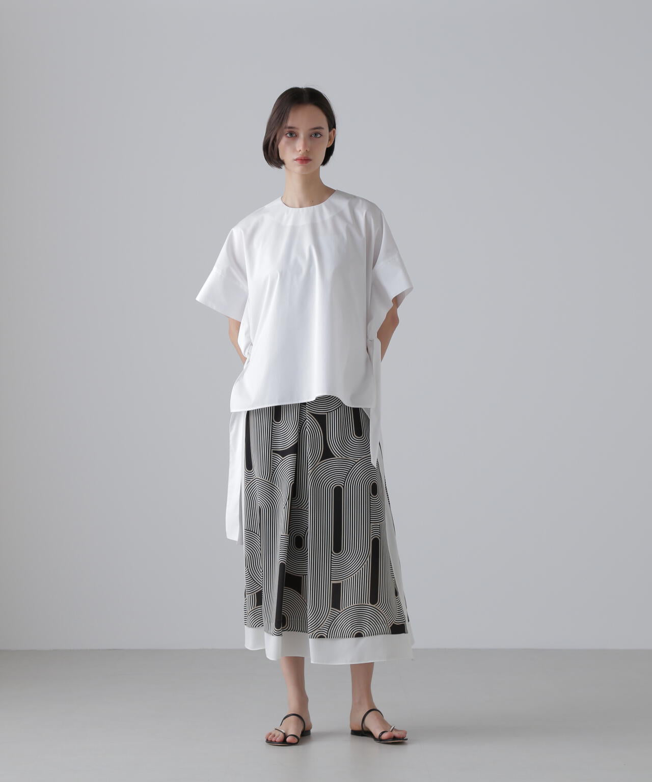 ミッドセンチュリーな幾何柄プリントが目を引くスカート