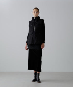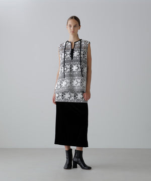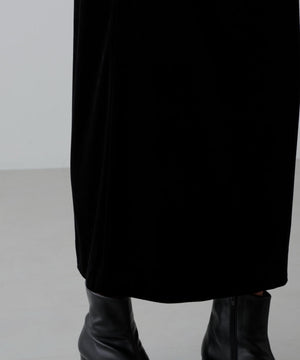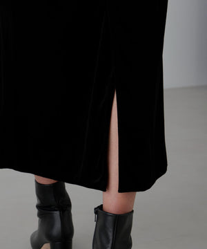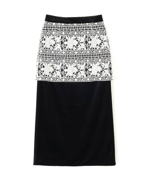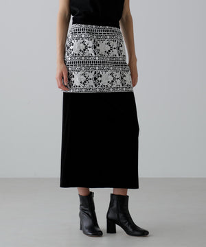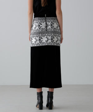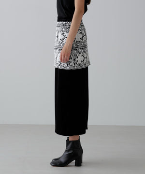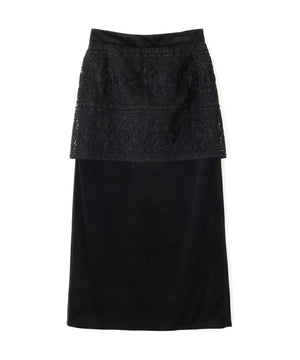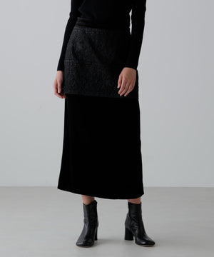 ストレートシルエットでアーカイブのレースとレイヤーされたベロアがコンビになったスカートです。
