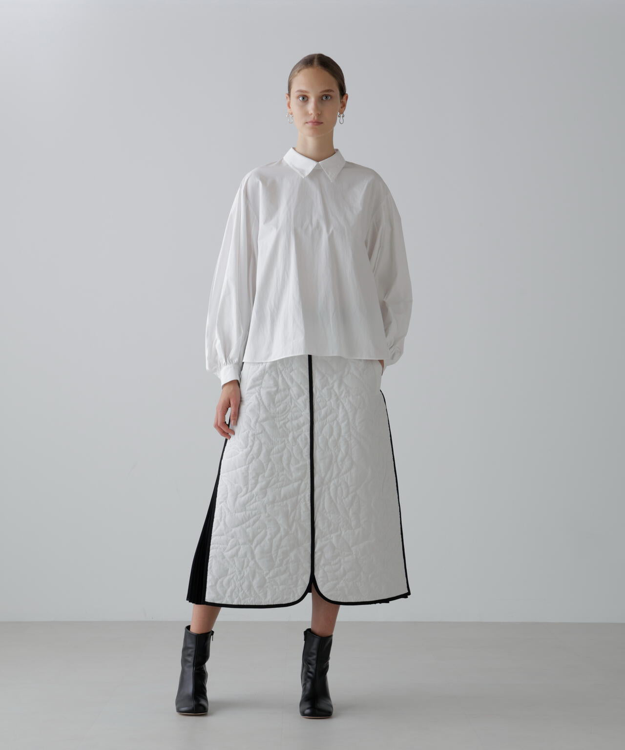 サイドに別素材のプリーツが挟み込まれており、ヘムとセンターのグログランパイピングがアクセントの1着です。