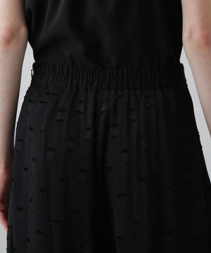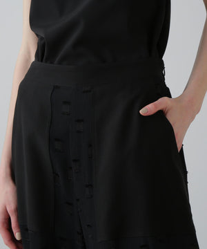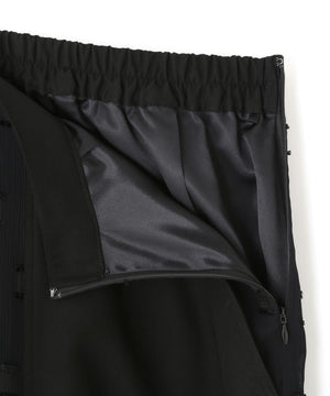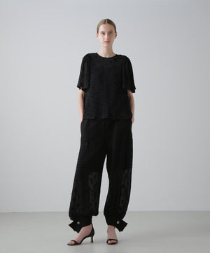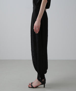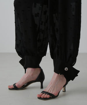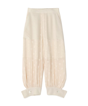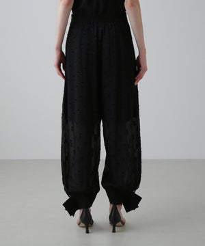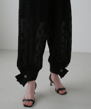 ルーズなシルエットのデザインパンツで、ポケットと裾部分に透けない別素材を施しています。