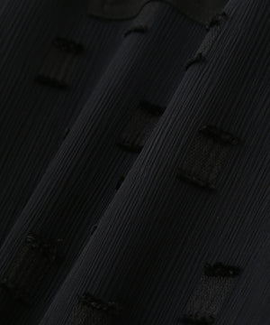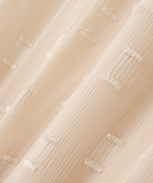 加工ではなく糸の撚糸と縮率差で楊柳の様なタテ畝を出し、光沢のあるポリエステル糸でアクセントのカットモチーフを表したジャカード素材です。