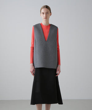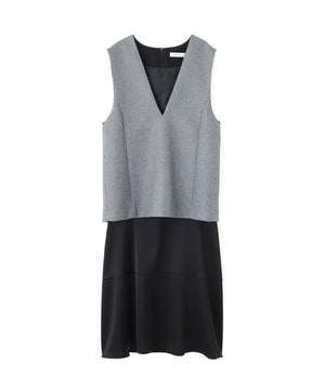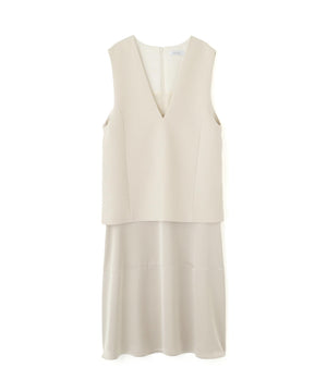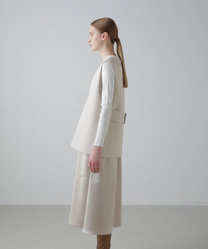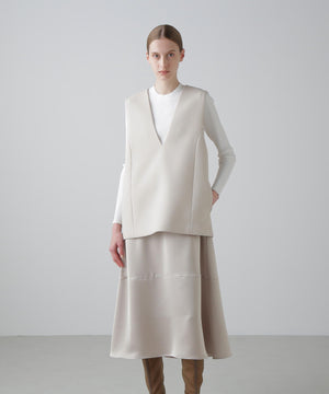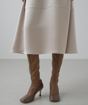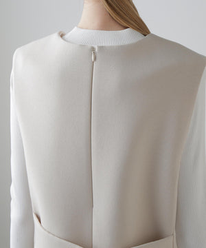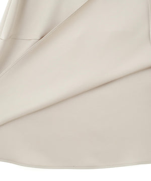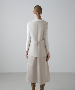 上部は柔らかなハリ感のあるボンデイング素材、下部はサテンのドレープ性のある素材でできたジャンパースカートになります。後ろ部分はベルトデザインになっています。