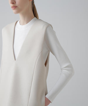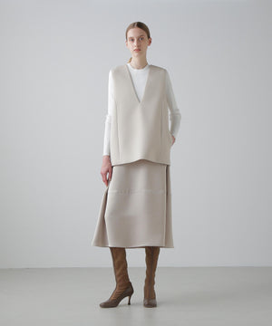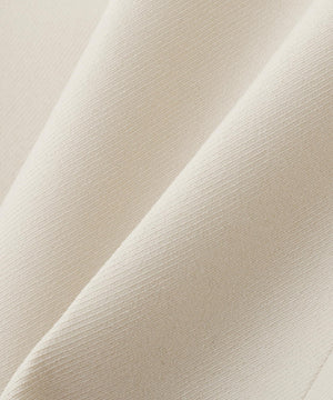 3種類のポリエステルを使用し、染着差を付けることで、メランジ調の奥行きのある見え方に染め上げた、畝感のあるソフトなツイル素材。スポンジを挟みこんでボンディングをすることで、特有の張り感とふくらみを持たせました。