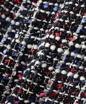 1本の糸に3色の色を染める“かすり染”の技法を使い、赤・青・白の3色を染めた表情のあるフラッグモール糸を使用。表情のあるツイード素材で仕立てました。