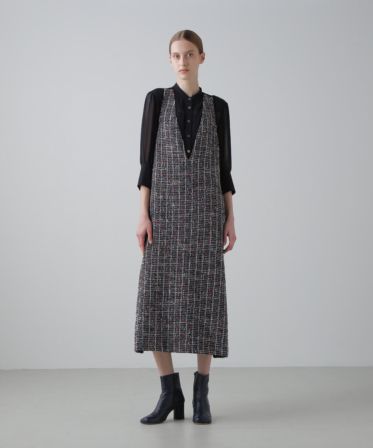 ファンシーツィード素材でできた、ジャンパースカートです。