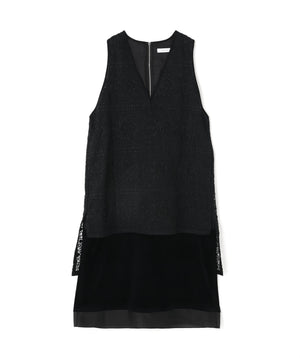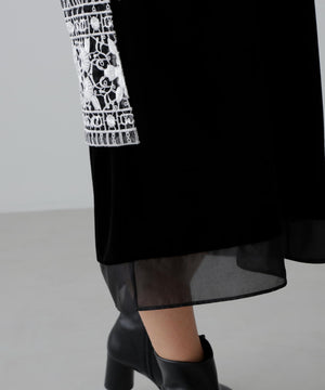 前身の裾からレイヤーされたベロアが見えるモダンで上品なドレスになります。