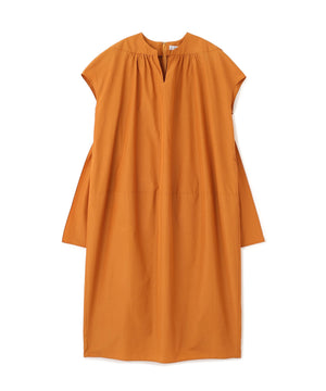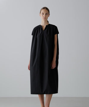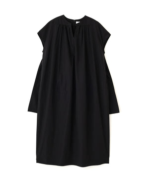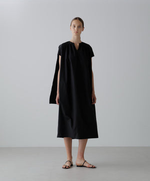 切り替えと肩ヨークからのタックでコクーンシルエットを表現した軽い素材のワンピースです。