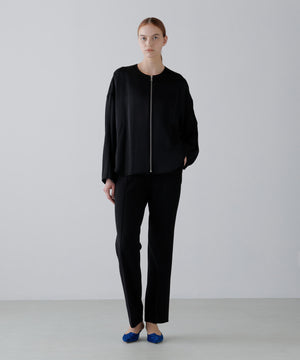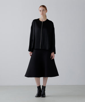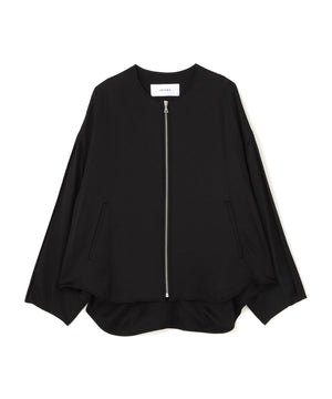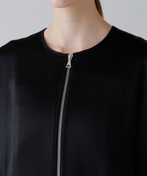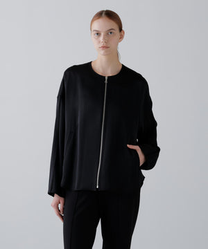 程よく張りがあるサテン素材で仕上げられたノーカラージップジャケットです。