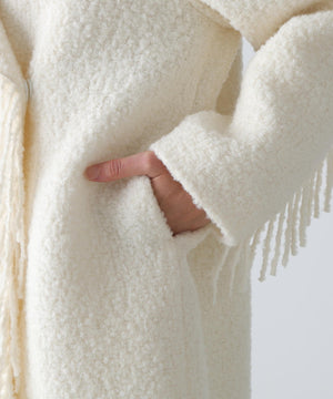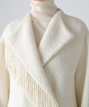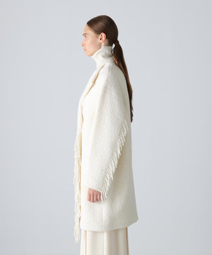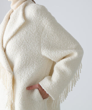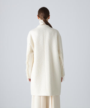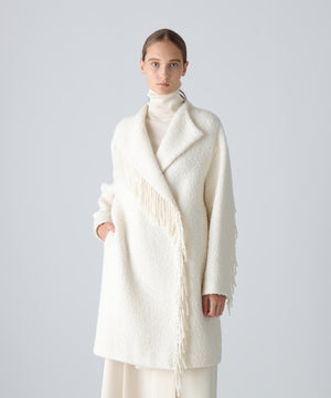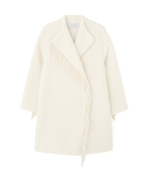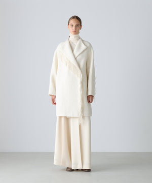 ややコクーン型のシルエットで襟端の部分にフリンジを施したモダンなコートになります。
