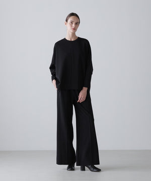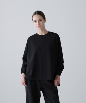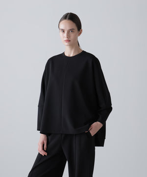 程良い厚みのダンボール調のカットソー素材で仕上げた万能プルオーバーです。後ろ身頃裾の裾に深いタックが入りヒップを包み込む女性らしい膨らみのあるシルエットに。