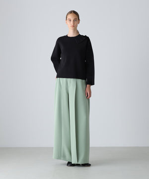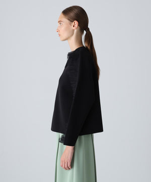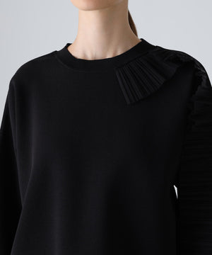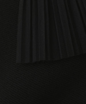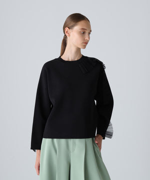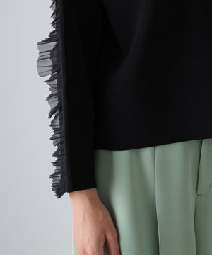 魚のひれをイメージしてクリスタルプリーツをかけたチュールをアシンメトリーに袖から襟ぐりにかけて配したニットトップス。