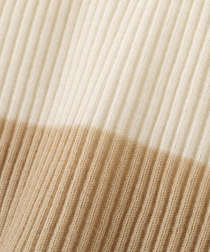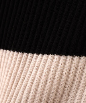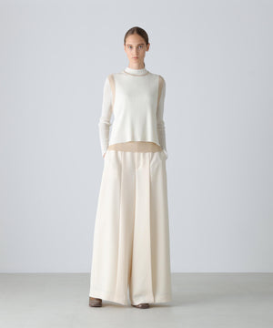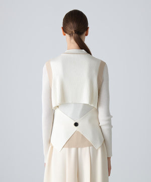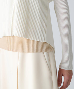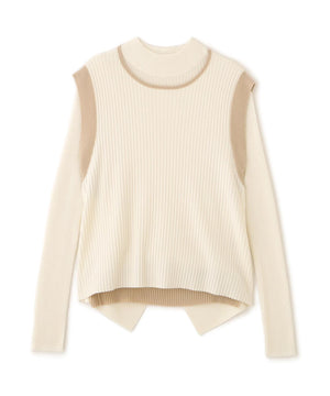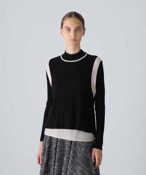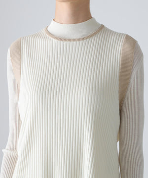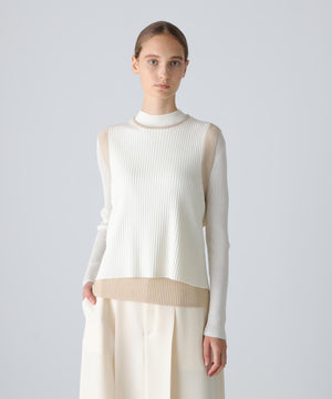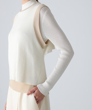 ややシアー感のある柔らかく肌触りの良いハイゲージのワイドリブトップスと総針針抜きでリブのように見える編地のベストをレイヤードして着用する商品です。