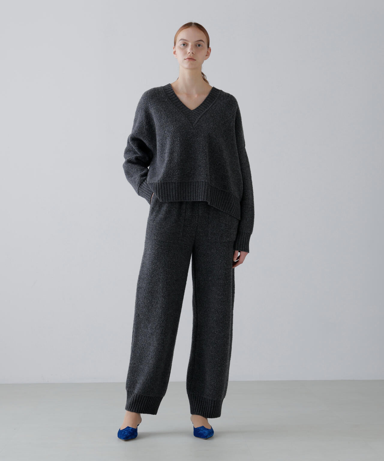 程よい太さのややバレル型のニットパンツになります。