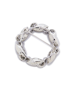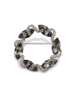 ブラックダイヤモンドカラーのカットガラスパーツがリース型についたブローチ。