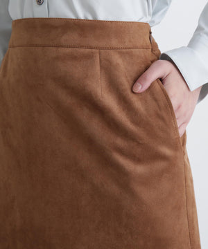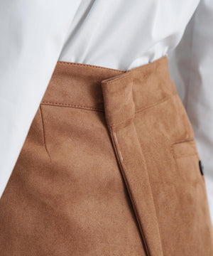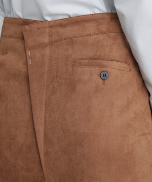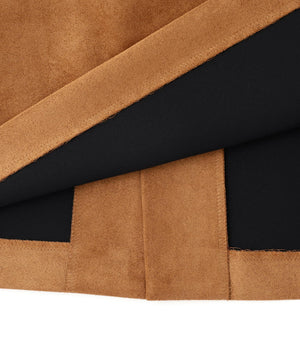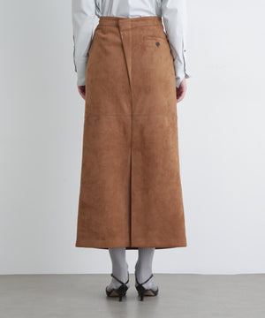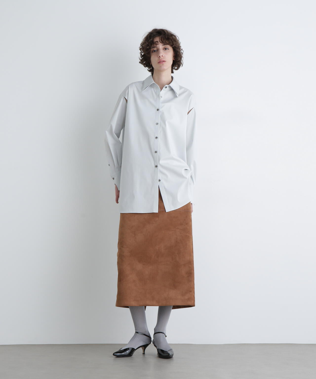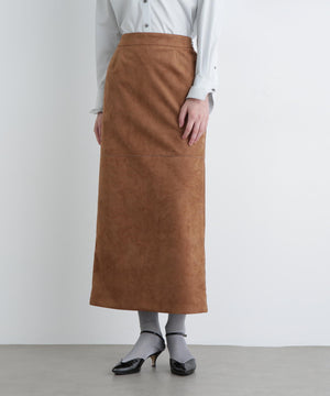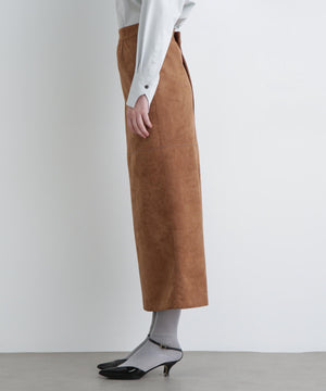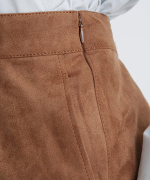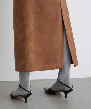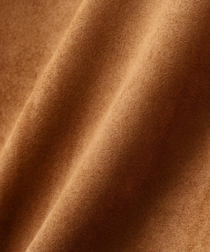 パイルの様な表情のふくらみのあるポリエステル糸を編み込み、表面を起毛することで、スウェード調の表情を持たせた素材で仕立てました。