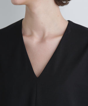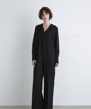 Vネックのストレートシルエットのコンビネゾンで袖部分がシャツスリーブになっています。