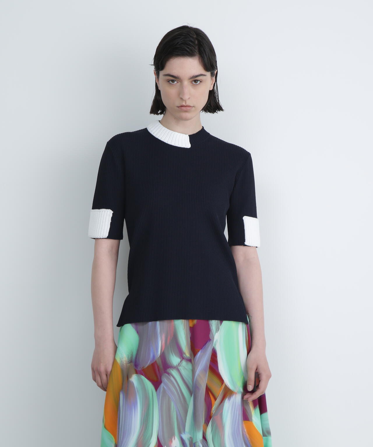 合繊素材のベースのニットに配色でポリエステルの別パーツがついたデザインニットになります。
