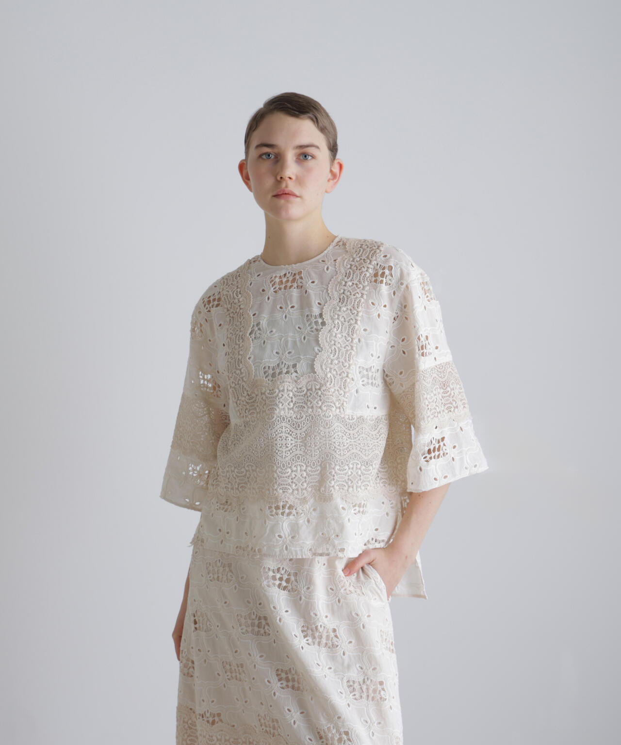コットンローンをベースに刺繍レースを施したアイレットエンブロイダリー素材を使用したブラウスです。